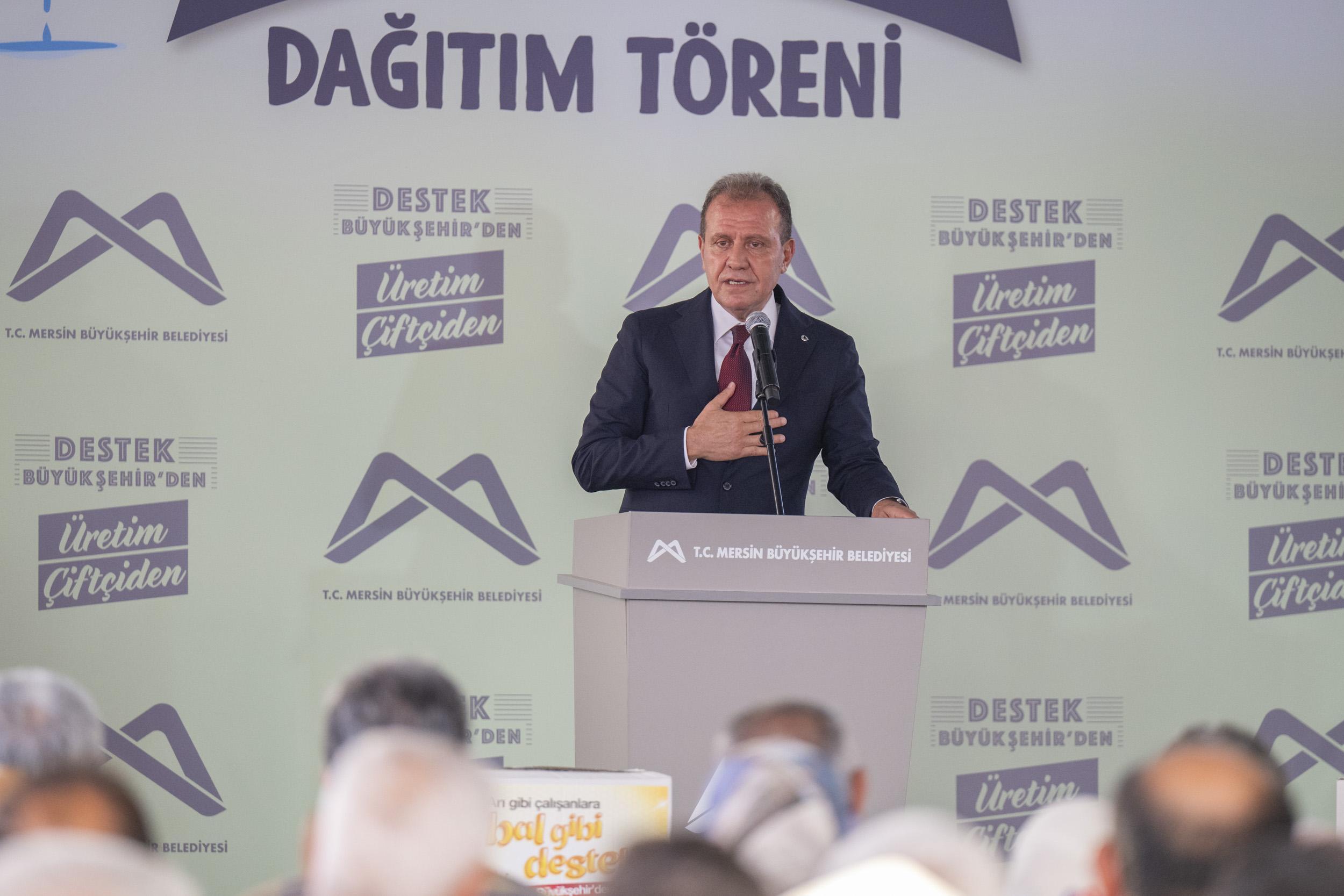 Mersin Büyükşehir Belediyesi Tarımsal Hizmetler Dairesi Başkanlığı'nın sulama borusu, makine ekipman ve arıcılık malzemeleri dağıtım törenine Büyükşehir Belediye Başkanı Vahap Seçer, CHP Mersin Milletvekilleri Gülcan Kış ile Hasan Ufuk Çakır, CHP İl Başkanı Koral Ömür, CHP İl Gençlik Kolları Başkanı Okan Kaya, CHP Akdeniz İlçe Başkanı Semih Palamut, Mersin Akdeniz Ziraat Odası Başkanı Musa Yılmaz, Mersin İli Arı Yetiştiricileri Birliği Başkanı Adem Kurt, Mersin Muhtarlar Derneği Başkanı Ali Gülgen, Toroslar Muhtarlar Derneği Başkanı Ali Yılmaz, Meclis üyeleri, kooperatif başkanları, muhtarlar, Mersin Büyükşehir Belediyesi ile MESKİ bürokratları ve çok sayıda üretici, çiftçi, yetiştirici ile vatandaş katılım sağladı.