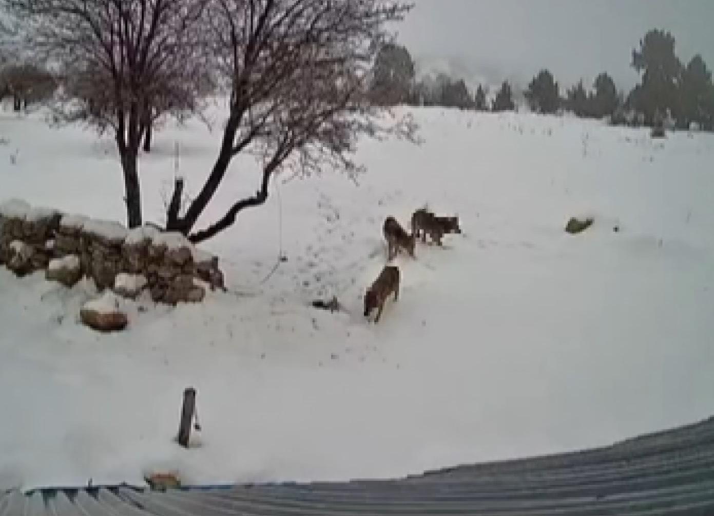 İlçeye bağlı Elmakuzu Mahallesi Galaba mevkiinde yerleşim alanına kadar yaklaşan kurtlar, bir evin önünde yiyecek aramaya başladı. Bir süre evin önünde bekleyen kurtlar daha sonra tekrar doğal alanlarına döndü. Bu anlar güvenlik kamerasına yansıdı. (DHA)