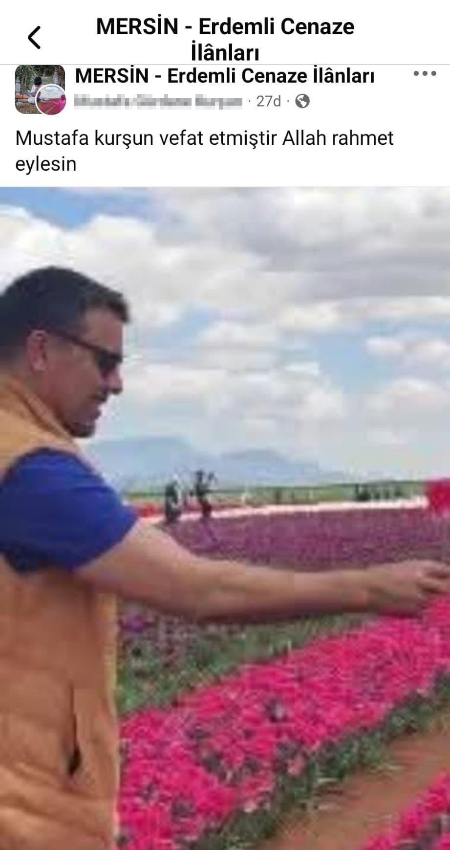 Mehmet DOĞANER/ERDEMLİ (Mersin), (DHA)- MERSİN'in Erdemli ilçesinde iş makinesi operatörü Mustafa Kurşun (41) hakkında sosyal medya üzerinden öldüğüne dair paylaşımlar yapıldı. Paylaşımları görenlerin kendisini araması ile durumdan haberdar olan Kurşun, savcılığa suç duyurusunda bulundu.