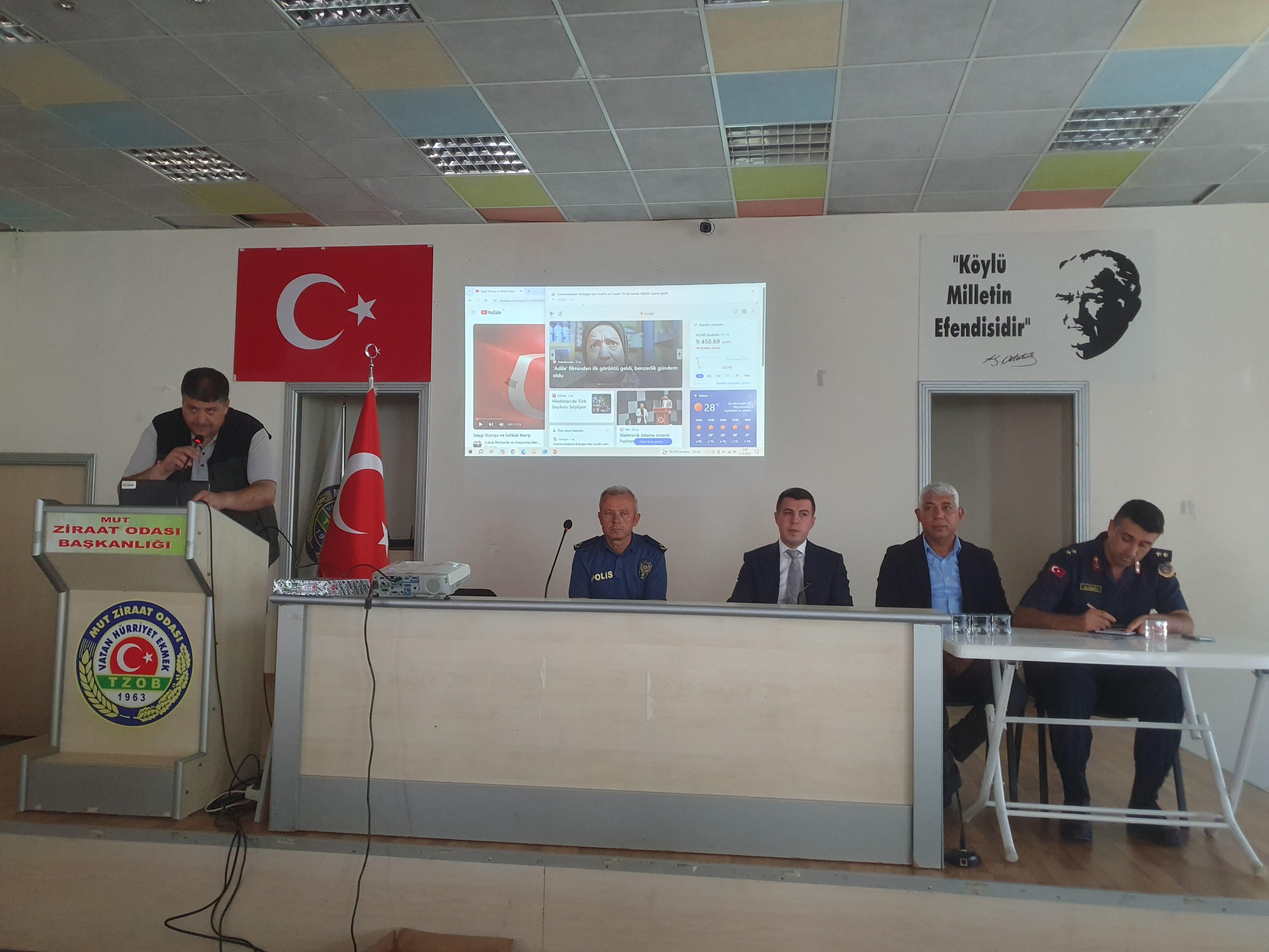 Mut Ziraat Odası toplantı salonunda yapılan toplantıya Kaymakam Vekili İsa Uğur, Belediye Başkan Yardımcısı Ali Tekin, İlçe İşletme Müdürü Utku Danış, Jandarma Bölük komutanı kıdemli Üsteğmen Murat Altınöz Emniyet Müdürü Mustafa Pehlivanoğlu, daire amirleri ve muhtarlar katıldı.