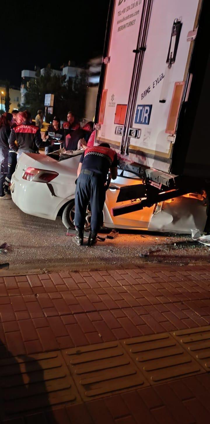 Kaza, dün saat 22.00 sıralarında, Mersin-Antalya kara yolu Atakent Mahallesi Susanoğlu mevkisinde meydana geldi. Sürücüsü henüz tespit edilemeyen 01 ABS 952 plakalı otomobil, yolun sağında park halindeki 33 BHS 93 plakalı TIR'a arkadan çarptı. Çevredekilerin ihbarı üzerine bölgeye jandarma, sağlık ve itfaiye ekipleri sevk edildi. TIR'ın dorsesinin altına giren otomobilde sıkışan 2 kişi, itfaiyecilerin çalışmasıyla çıkarıldı. Yaşamlarını yitirdiği belirlenen 2 kişinin Yiğit Turan ve Ayşegül Kırlangıç olduğu tespit edildi. Kaza yerinde yapılan incelemenin ardından Turan ve Kırlangıç'ın cansız bedenleri, otopsi için morga kaldırıldı. Öte yandan TIR'ı yolun kenarına park ettiği öne sürülen Ö.Ö., ifadesi alınmak üzere Jandarma Komutanlığı'na götürüldü. Jandarma, kazayla ilgili inceleme başlattı. (DHA)