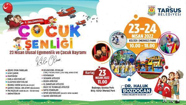 Tarsus Belediyesi’nin geleneksel olarak düzenlediği Çocuk Şenliği bu yılda kaldığı yerden devam ediyor. 23 Nisan saat 11.00’da Aznakay Parkı’ndan karnaval havasında bir kortej ile başlayacak olan etkinlikler Kültür (Merkez) Parkı’nda kurulacak oyun grupları, atölyeler, gösteriler, yarışmalar ile 2 gün boyunca devam edecek. İllüzyon, kukla tiyatrosu, konserler, bubble şov, pantomim, gibi sahne gösterilerinin yanısıra okulların hazırladığı gösterilerin de sergileneceği etkinlikler ile çocuklar doya doya eğlenme imkânı bulacak.
