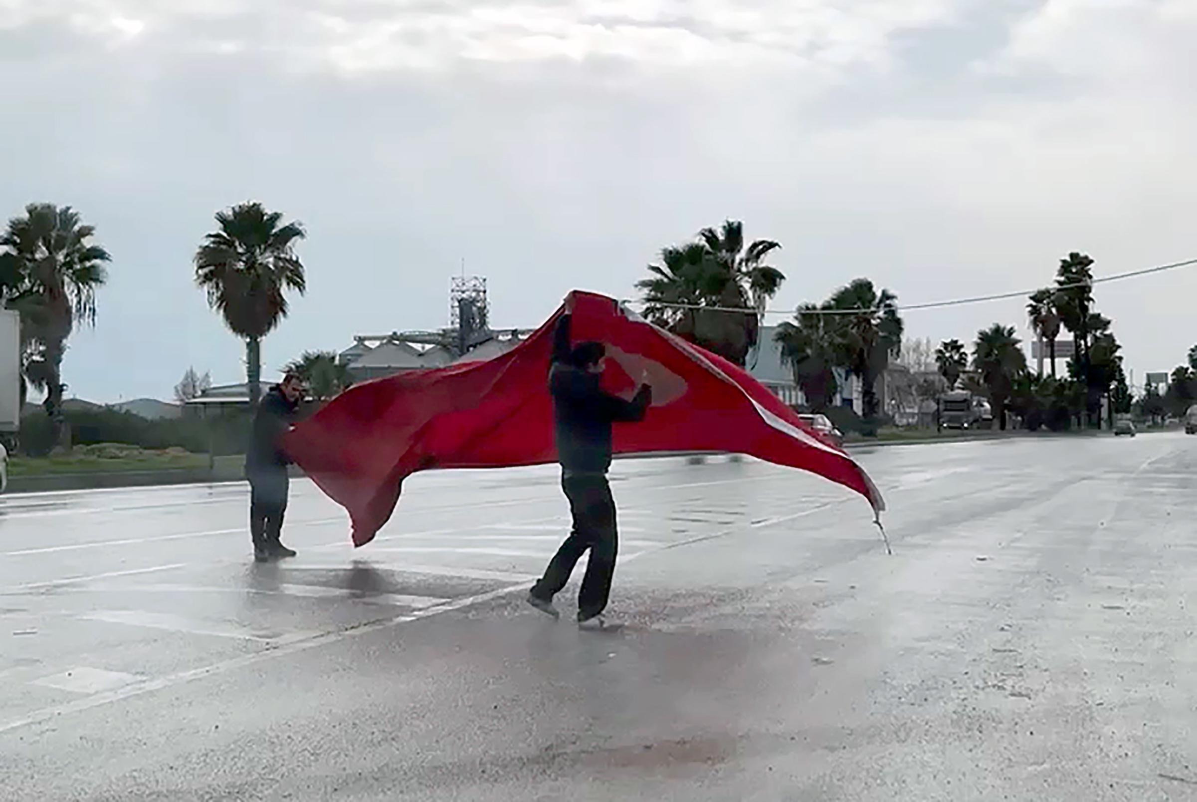Tarsus ilçesi D400 kara yolu kenarında bulunan gönderdeki büyük Türk bayrağı, şiddetli rüzgar nedeniyle bulunduğu yerden kopup, yola düştü. Yerdeki Türk bayrağını gören sürücüler, araçlarını durdurdu. Otomobillerinden inen 2 sürücü, Türk bayrağını kaldırarak katlayıp, güvenli bir alana bırakarak, yetkililere bilgi verdi. Bayrağın düştüğü noktada bekleyen sürücüler, daha sonra yollarına devam etti. O anlar cep telefonu kamerasıyla kaydedildi. (DHA)