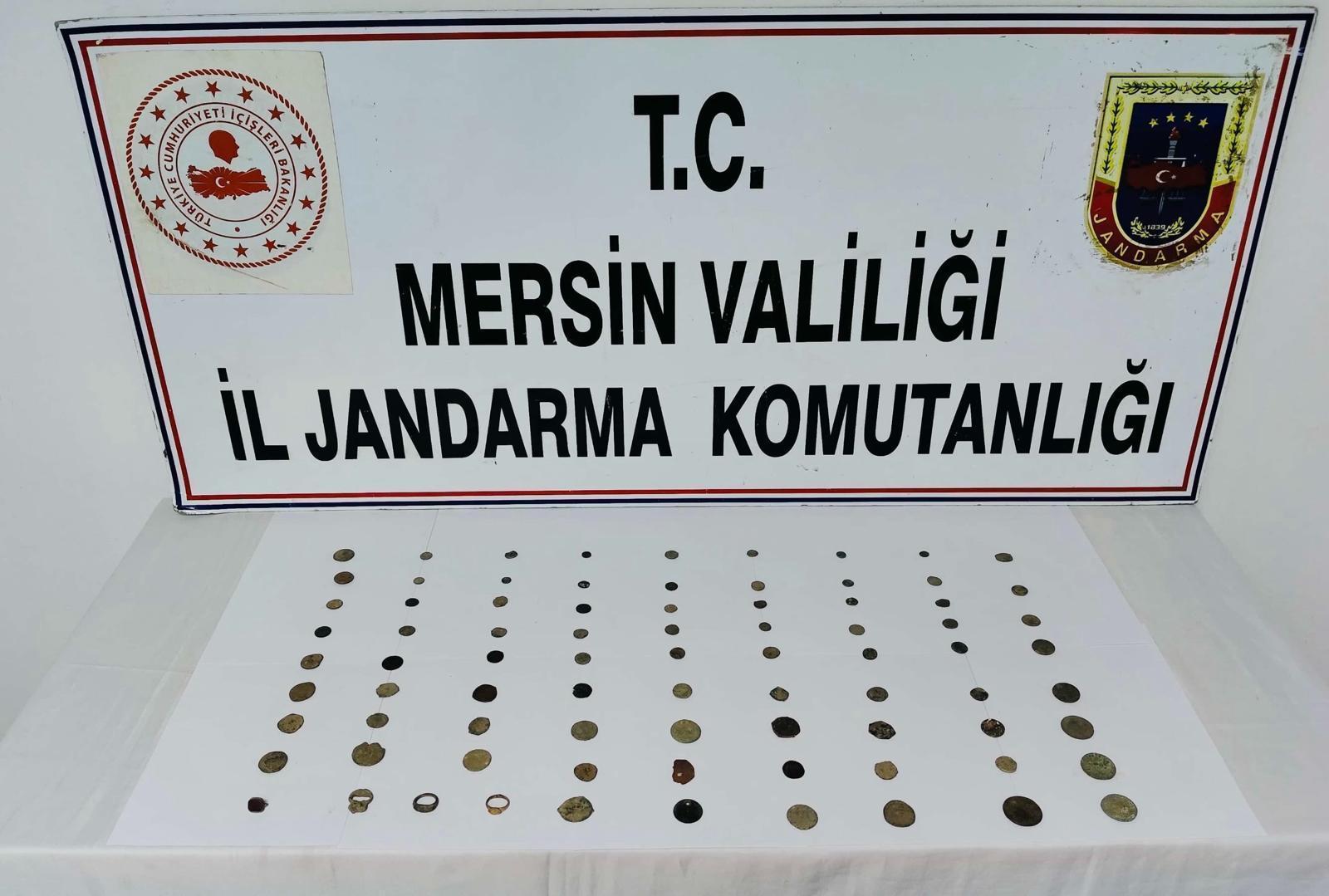Şüphelinin aracında arama yapan jandarma, Roma ve Bizans dönemine ait olduğu değerlendirilen 76 sikke ile 4 yüzüğe el koydu. El konulan tarihi eserler incelenmek üzere Mersin Müze Müdürlüğüne teslim edildi.