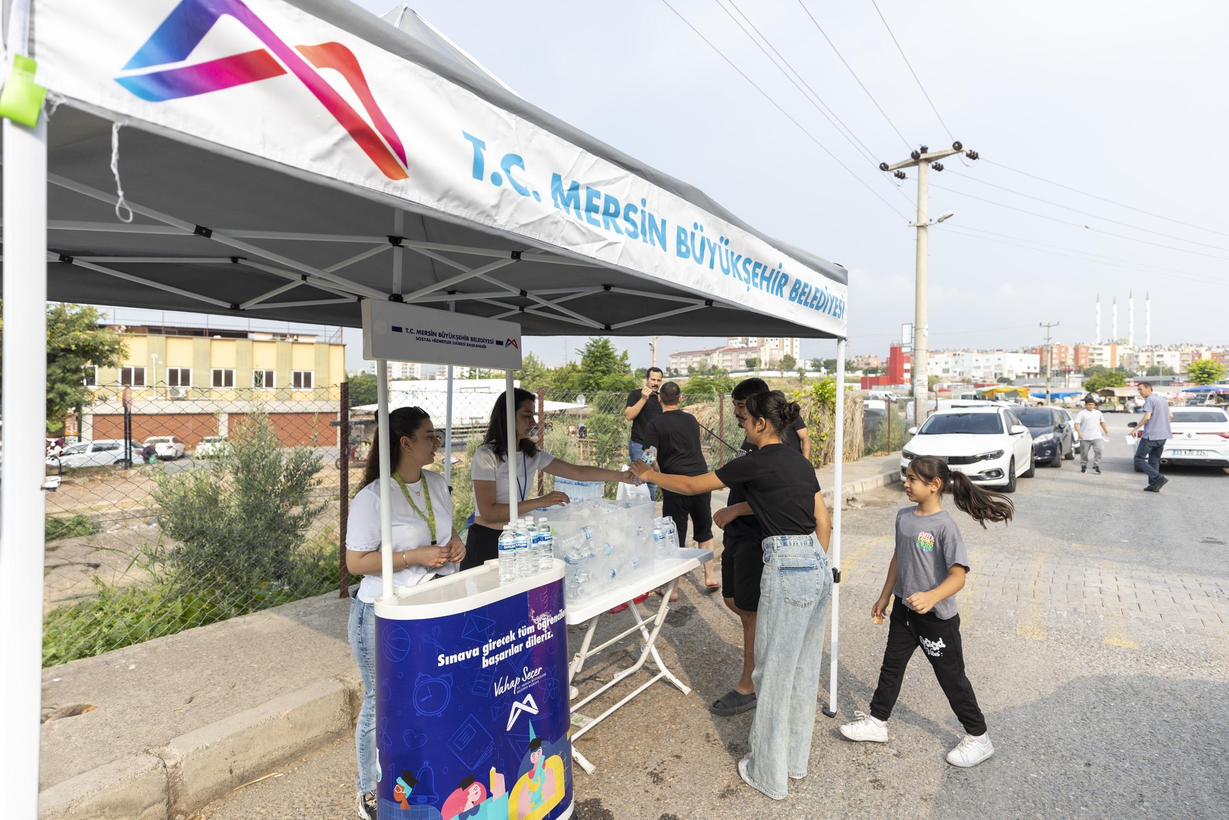 MERSİN, (DHA)- MERSİN’de Liselere Geçiş Sistemi (LGS) kapsamında yapılan merkezi sınav öncesi okul önlerinde stant kuran Büyükşehir personeli, sınava giren öğrencilere su ikramında bulundu.