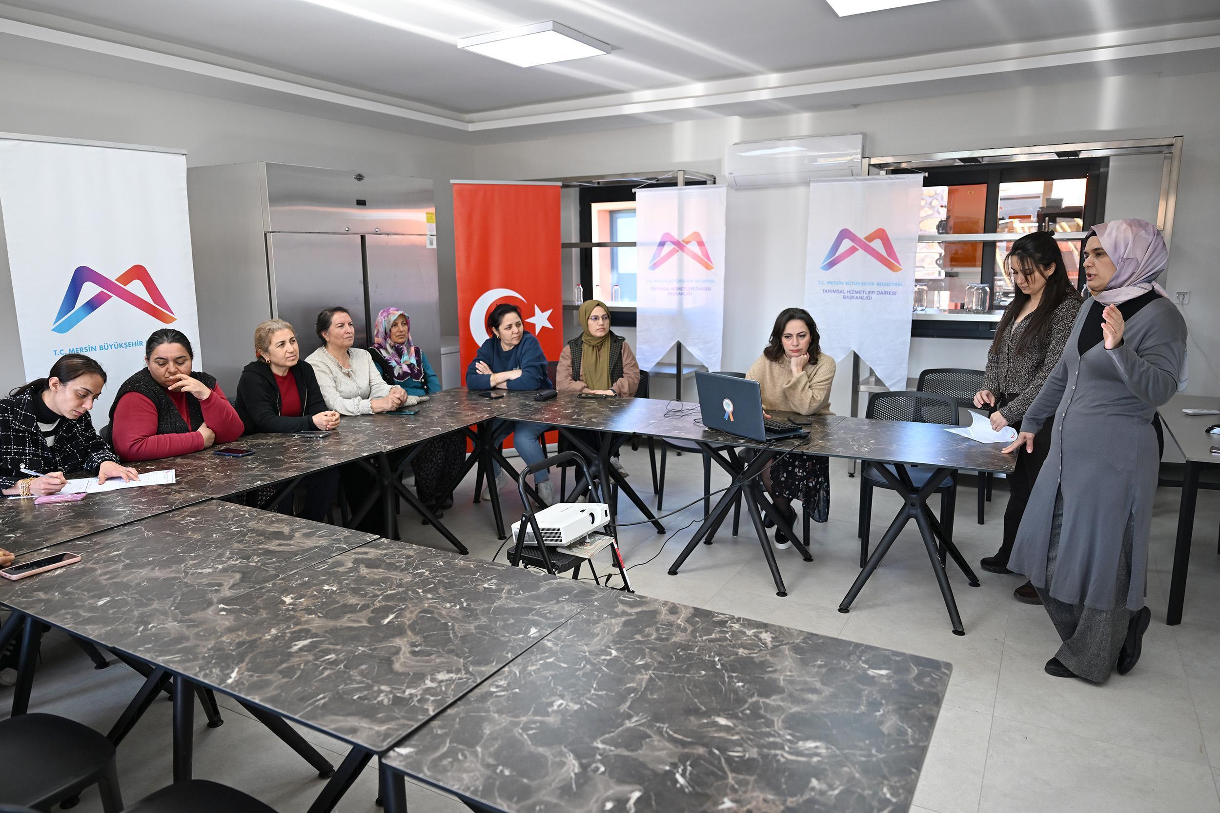 Büyükşehir Belediyesi Tarımsal Hizmetler Dairesi Başkanlığı ile Mersinden Kadın Kooperatifi iş birliğinde, Toroslar ilçesinde eski köy okulunun dönüştürülmesiyle kurulan atölyede gerçekleştirilen eğitimlerde, atölyeden yararlanmak isteyen kadın üreticiler birçok konuda bilgi edindi. Büyükşehir Belediyesi’nde görev yapan Gıda Mühendisi Döndü Gürlekoğlu tarafından makine ve ekipman tanıtımı yapılırken, Gıda Teknikeri Ayşegül Tor Karacan ise kapsamlı hijyen eğitimi verdi. Üretici kadınlar atölye alanını gezerek, kurulu ekipmanlar hakkında detaylı bilgi aldı.