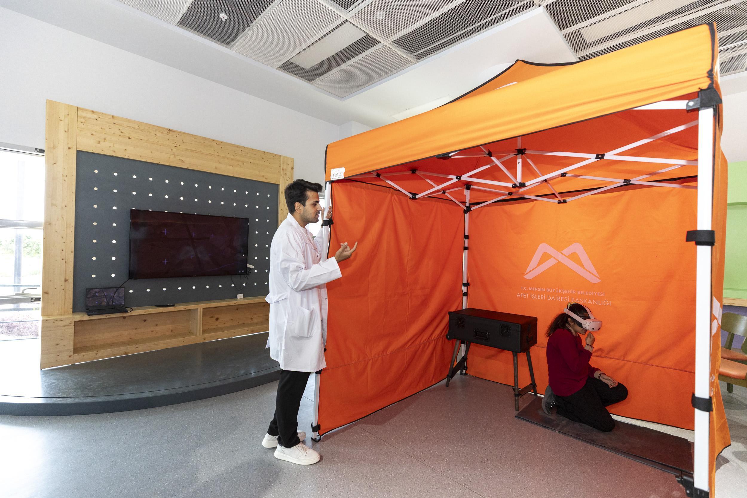 MERSİN, (DHA)- MERSİN Büyükşehir Belediyesi, Mercan 100’üncü Yıl İklim ve Çevre Bilim Merkezi’nde sanal gerçeklik (VR) teknolojisiyle deprem farkındalık eğitimi veriliyor.