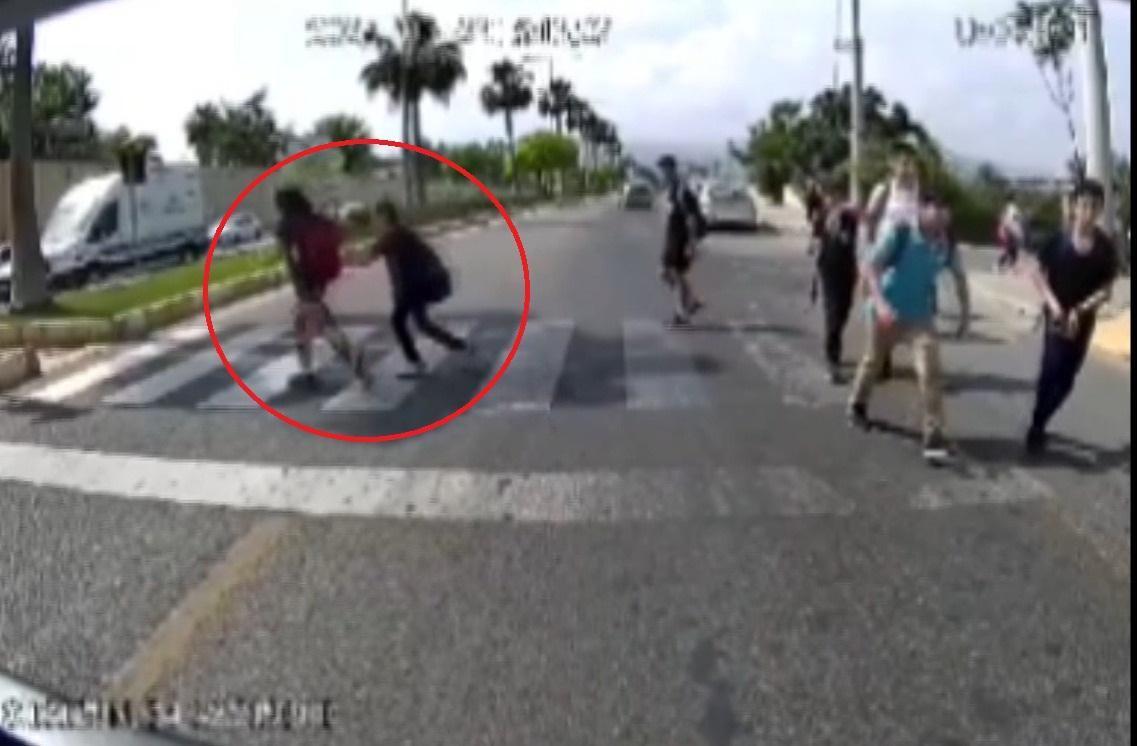 Öte yandan kaza, yayalara yol veren belediye otobüsünün kamerasına yansıdı. Görüntülerde ele tutuşup karşıya geçmeye çalışan öğrencilere kamyonetin çarptığı anlar yer aldı. (DHA)