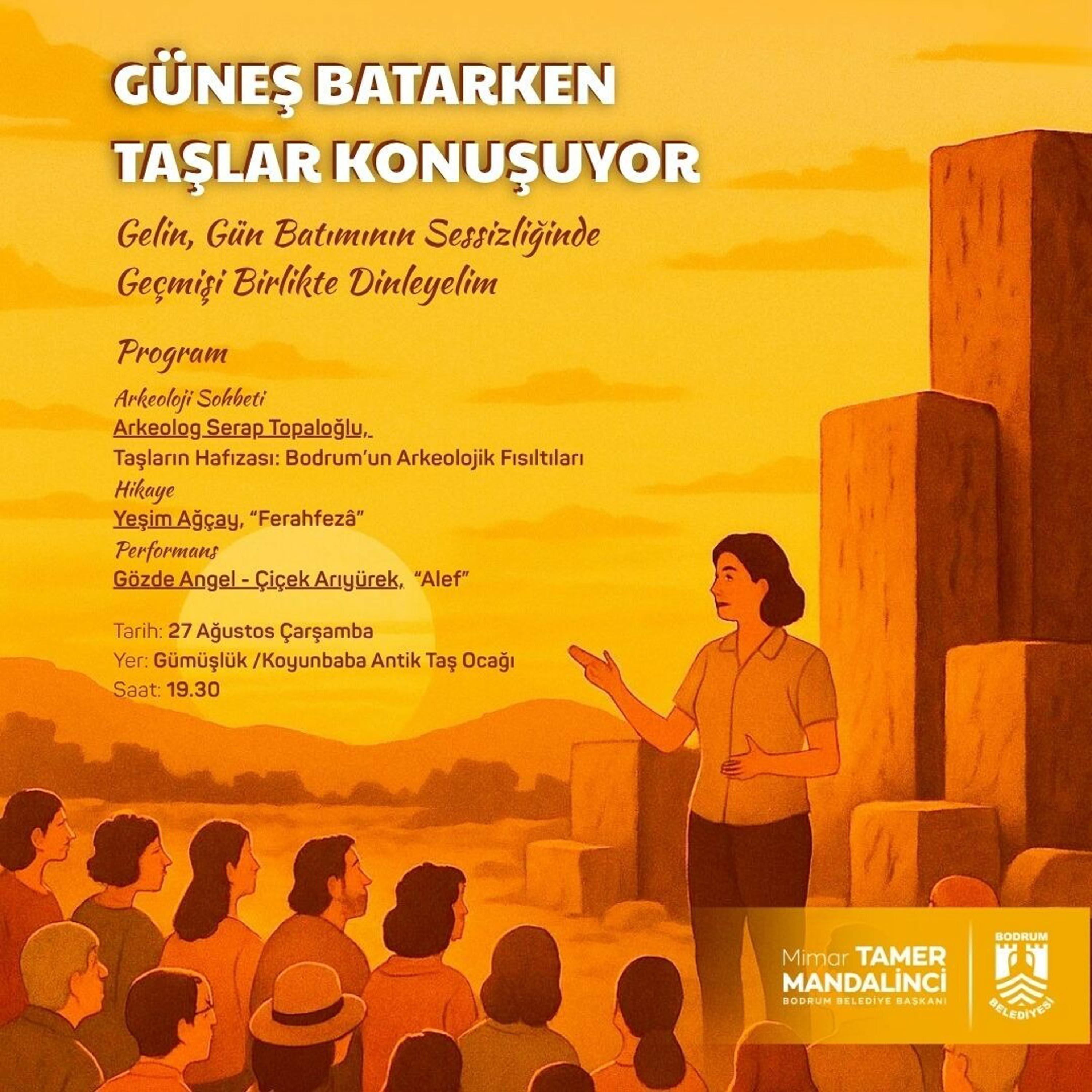Kültür ve Sosyal İşler Müdürlüğü bünyesinde faaliyet gösteren Pedasa ve Leleg Uygarlığı Araştırma ve Uygulama Birimi, 'Güneş Batarken Taşlar Konuşuyor' adlı kültür ve sanat içerikli bir etkinliğe imza atıyor. Bodrum'da bir ilk olduğu belirtilen etkinlikte, Bodrum Belediyesi personeli Arkeolog Serap Topaloğlu, 'Taşların Hafızası: Bodrum'un Arkeolojik Fısıltıları' başlıklı söyleşisiyle katılımcıları Bodrum'un arkeolojik geçmişine dair interaktif bir sohbetle buluşturacak. Ardından, Yeşim Ağçay, 'Ferahfeza' adlı hikayesiyle dinleyicileri zamanda bir yolculuğa çıkaracak. Gecenin sonunda ise Gözde Angel ve Çiçek Arıyürek 'Alef' adlı dans performanslarıyla taşların arasında sanat dolu bir atmosfer yaratacak.