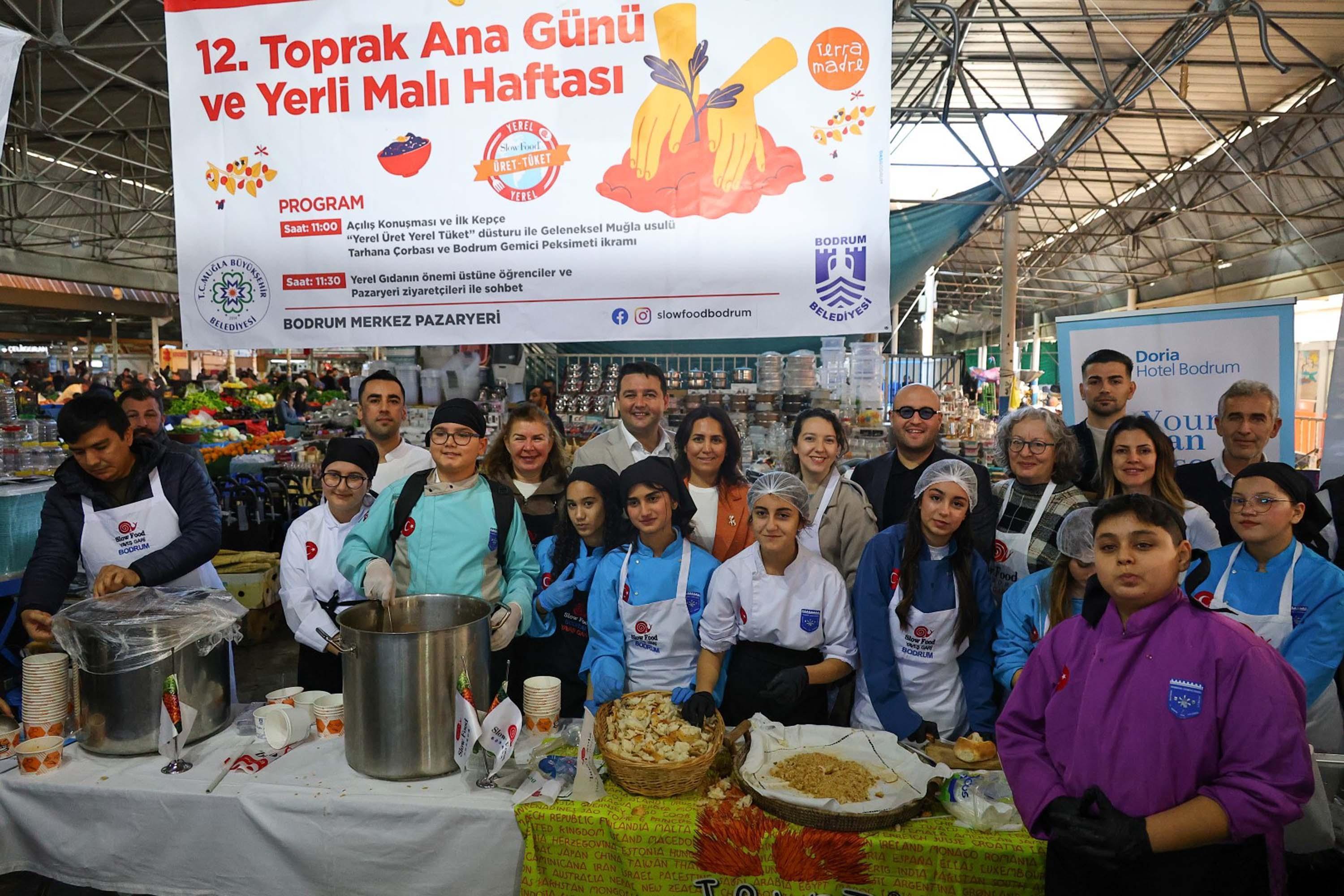 Bodrum Belediyesi ve Muğla Büyükşehir Belediyesi destekleriyle Slow Food - Yaveş Gari Bodrum Birliği tarafından düzenlenen 12. Toprak Ana Günü ve Yerli Malı Haftası, Bodrum Merkez Pazaryeri'nde etkinlikle kutlandı. Yerel üreticiye, doğaya ve toprağın bereketine dikkat çekmeyi amaçlayan ve Toprak Ana Günü'nde aynı zamanda Yerli Malı Haftası da kutlanarak bölgenin geleneksel gıda kültürü tanıtıldı. Geleneksel Muğla usulü tarhana çorbası ve Bodrum gemici peksimetinin ikram edildiği etkinliğe, Bodrum Belediye Başkanı Tamer Mandalinci'yi temsilen Belediye Başkan Yardımcısı Ercan Pehlivan, Muğla Büyükşehir Belediyesi İlçe Hizmetleri 1. Bölge Dairesi Başkanı Kadriye Erkal Yıldırım ve vatandaşlar katıldı. Slow Food hareketinin temel hedefi olan 'iyi, temiz ve adil gıda' mottosuyla gerçekleştirilen etkinlikte, yerel üretimin önemi vurgulandı. Etkinlik kapsamında öğrencilerle yapılan söyleşide yerel gıdaya erişimin, üreticinin desteklenmesinin ve sürdürülebilir tarım uygulamalarının önemine dikkat çekildi. Bodrum Belediyesi ve Muğla Büyükşehir Belediyesi olarak Tarımsal Hizmetler Müdürlüğü'nün yürüttüğü çalışmaların da ele alındığı programda, yerel tohumların korunması, çoğaltılması ve geleceğe aktarılması konusunda yapılan faaliyetler anlatıldı. Etkinlikte üreticiler, öğrenciler ve vatandaşlar pazaryeri içerisinde bir araya gelerek Bodrum'un yerel değerleri üzerine sohbet etti.