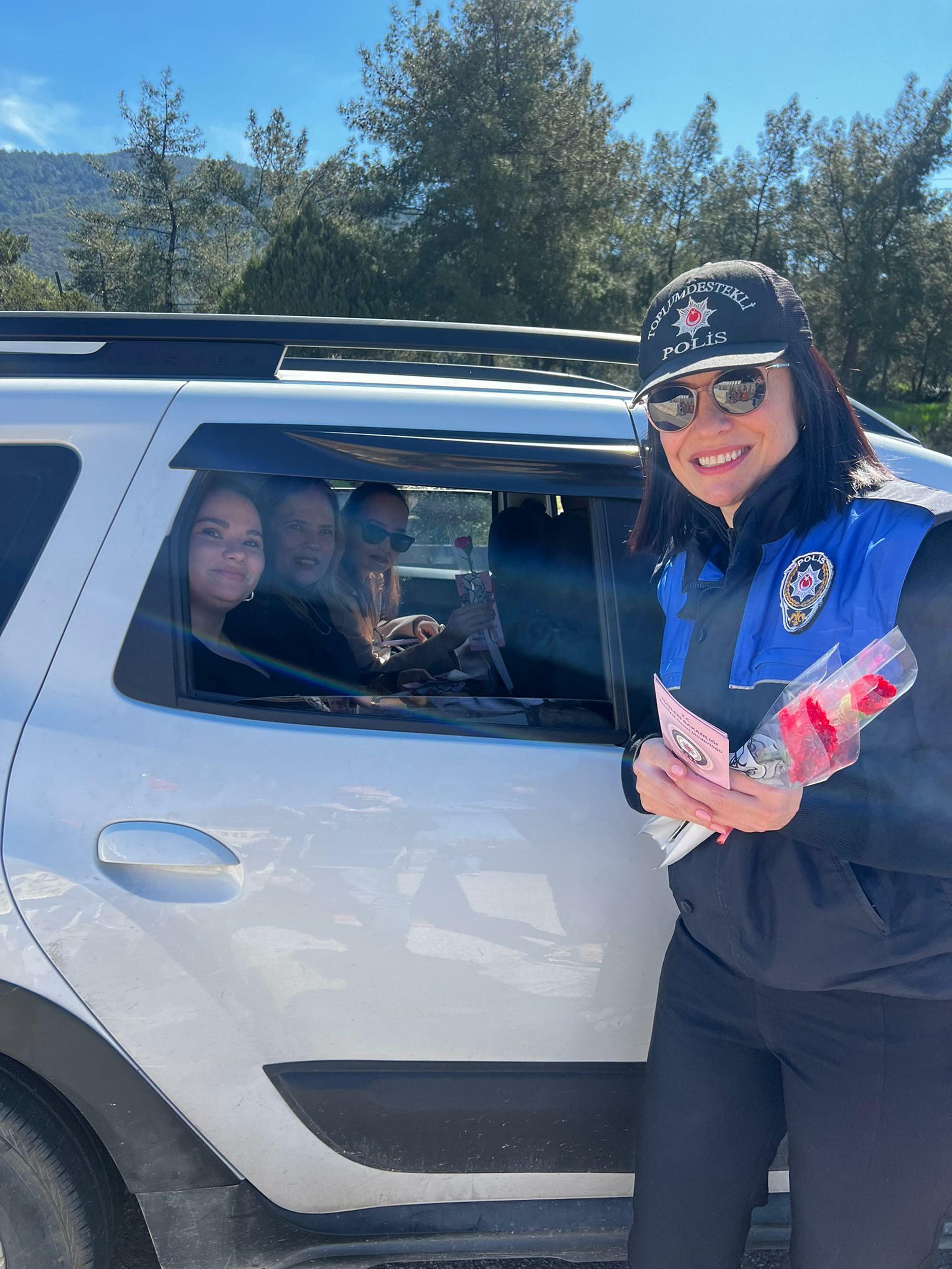 Fırat AKAY / BODRUM (Muğla), (DHA)-MUĞLA’nın Bodrum ilçesinde 8 Mart Dünya Kadınlar Günü dolayısıyla gerçekleştirilen farkındalık etkinliğinde, polis ekipleri kadın sürücü ve yolcuların gününü kutlayarak Kadın Destek Uygulamasını (KADES) tanıtıp, karanfil dağıtıldı.