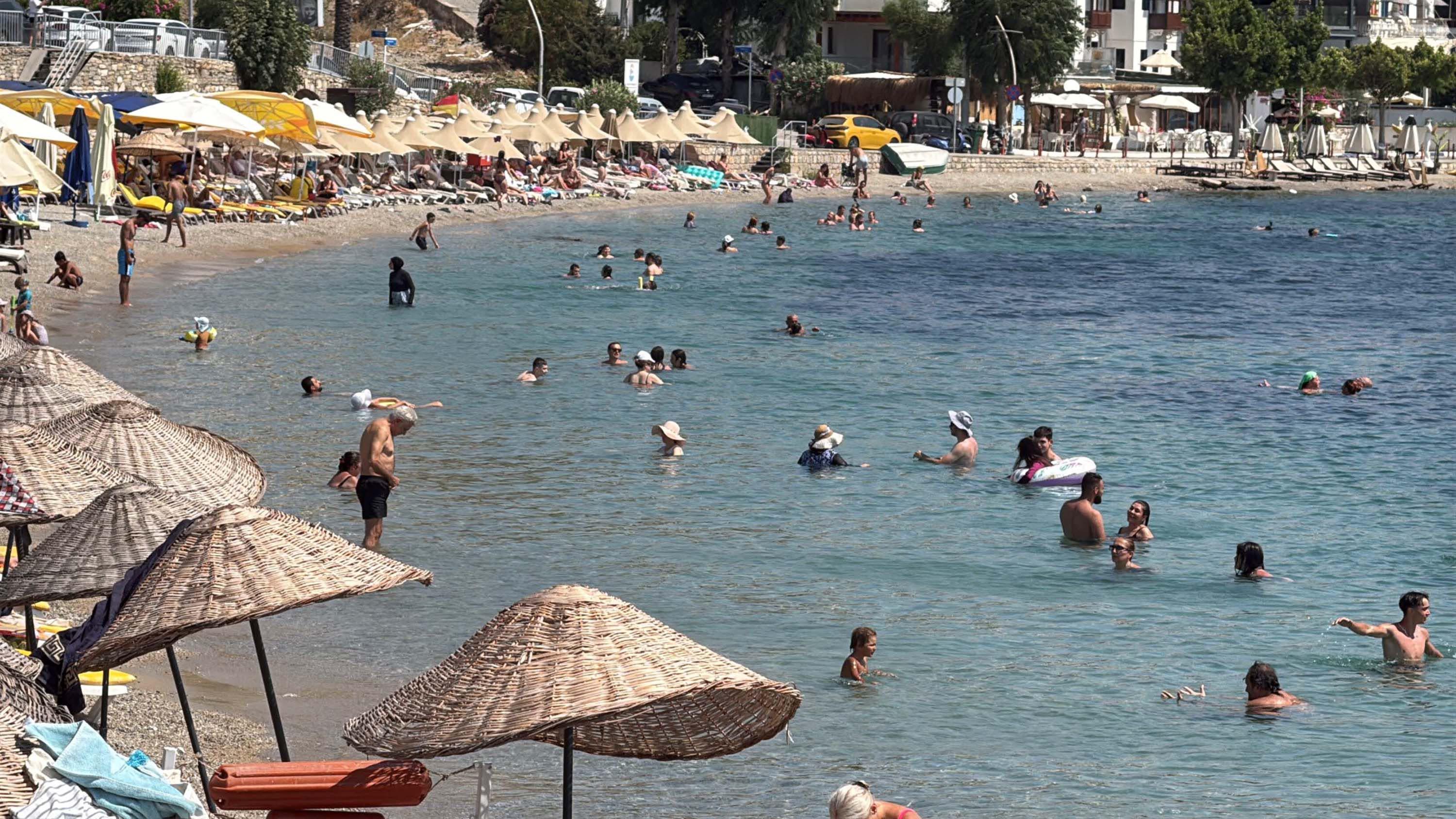 Dünyanın önemli turizm destinasyonlarından Bodrum'da sıcak hava etkili oldu. Hava sıcaklığının 42, deniz suyu sıcaklığının 27 derece olduğu ilçeye gelen yerli ve yabancı turistler hem denizin hem de güneşin keyfini çıkardı. Kimi denize girip serinledi, kimi kumsalda güneşlendi. Kumbahçe sahili başta olmak üzere Bitez, Gümbet, Ortakent, Türkbükü gibi plajlarda yoğunluk yaşandı. (DHA)