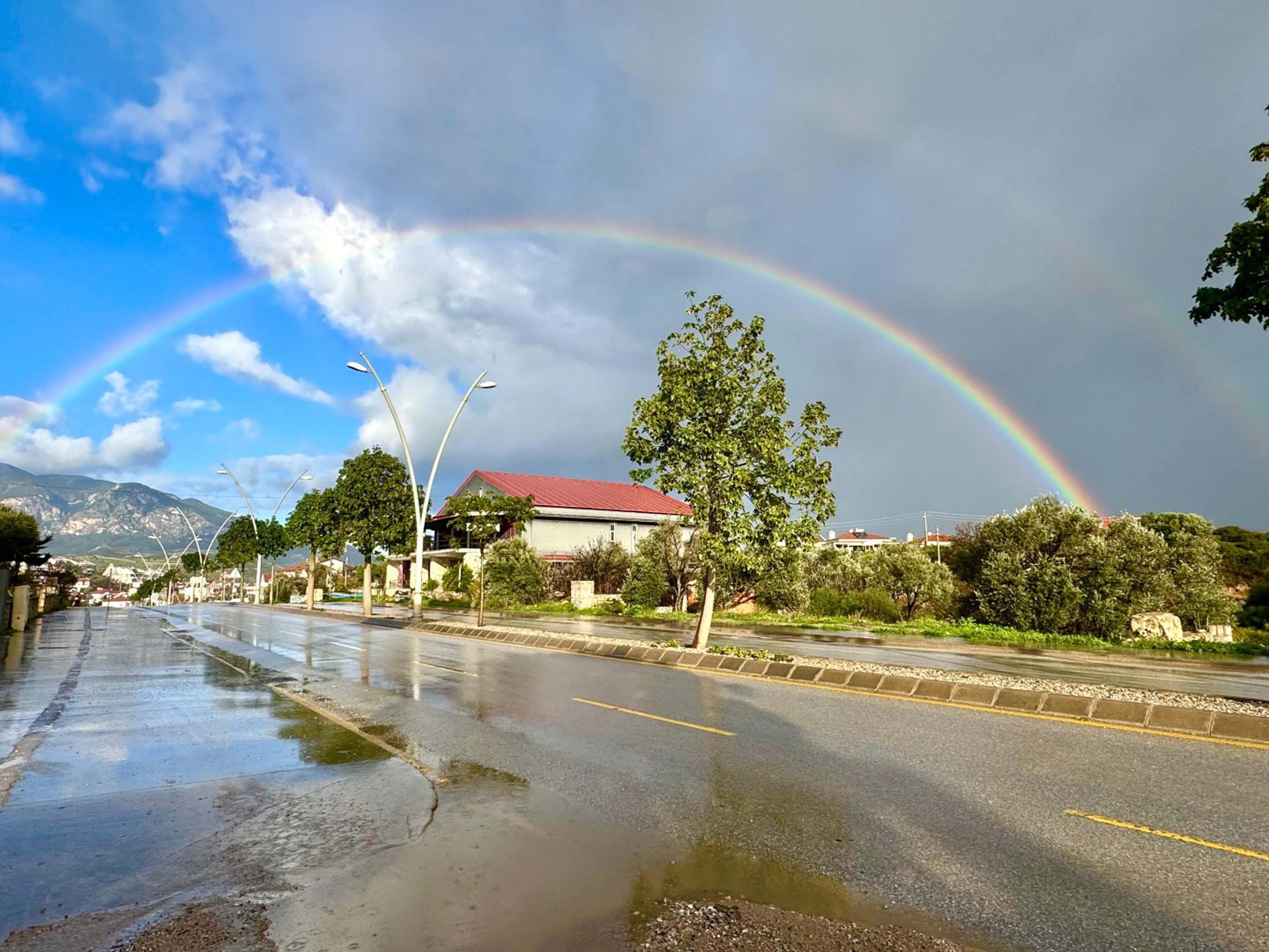 Datça ilçesinde sabah saatlerinde başlayan sağanak, kısa süreli etkili oldu. Yağmur bulutlarının bir anda dağılıp güneşin yüzünü göstermesiyle, çift gökkuşağı ortaya çıktı. Çift gökkuşağı görenleri hayran bıraktı. Gökkuşağının sunduğu görsel manzara vatandaşlar tarafından cep telefonlarıyla kaydedildi.(DHA)