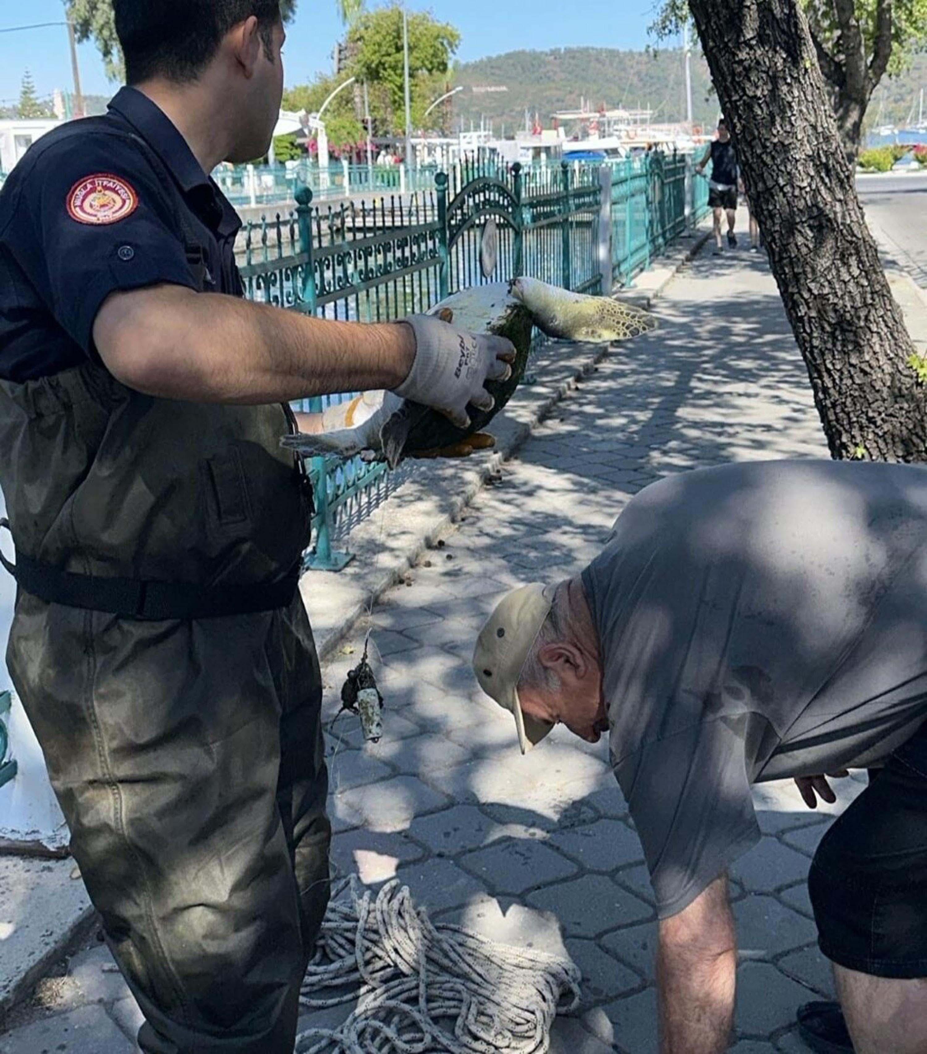 Gülgün AKYOKUŞ/ FETHİYE (Muğla), (DHA)-MUĞLA'nın Fethiye ilçesinde, ayağına misina dolanan deniz kaplumbağası, itfaiye ekipleri tarafından kurtarıldı.