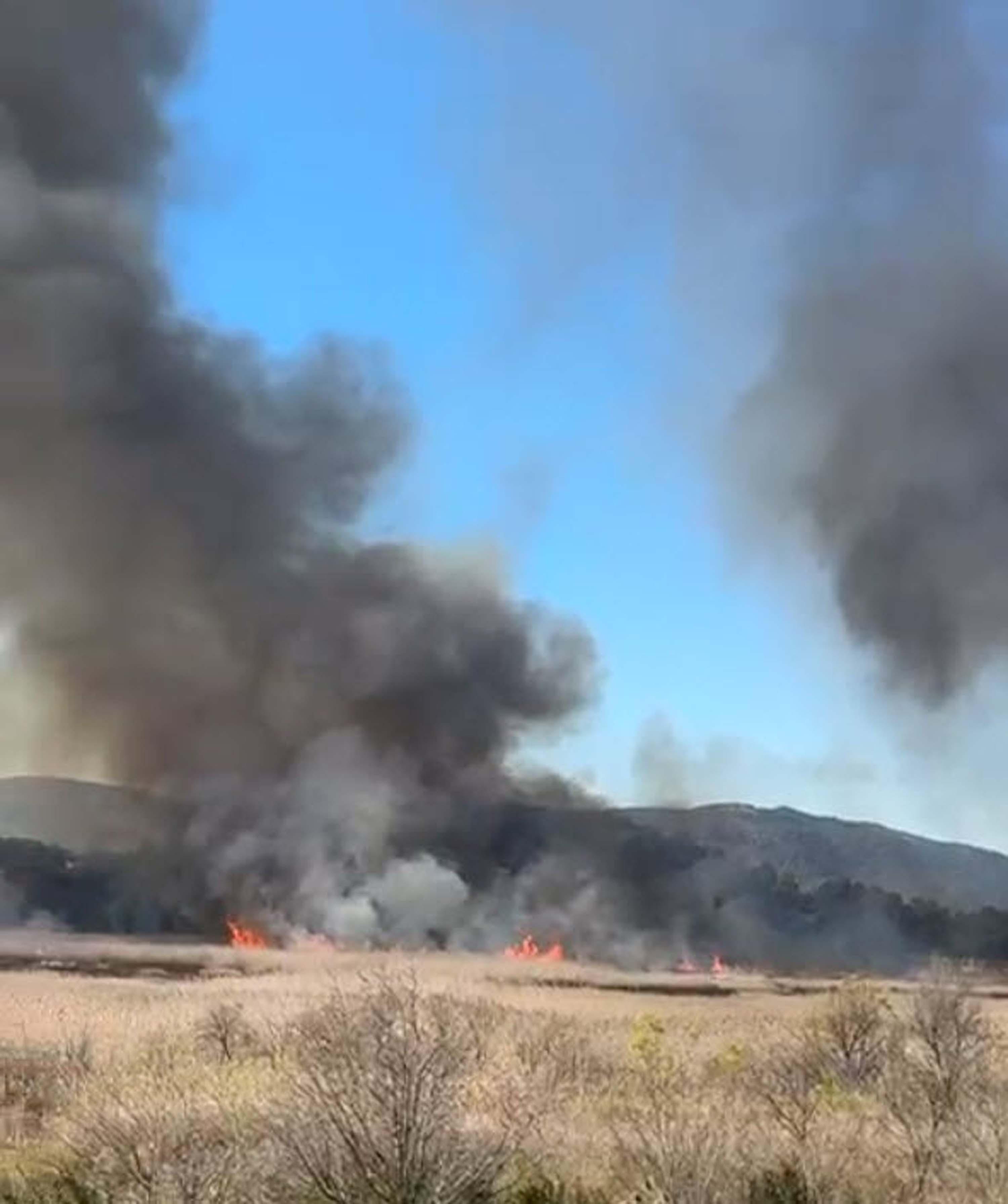 Köyceğiz Gölü'nün Gedova Adası mevkisindeki sazlık alanda, öğle saatlerinde yangın çıktı. Yükselen dumanı fark edenler, 112 Acil Çağrı Merkezi'ne ihbarda bulundu. İhbarla bölgeye itfaiye ve Muğla Orman Bölge Müdürlüğü ekipleri sevk edildi. Çok sayıda kuş türünün bulunduğu ve 50 dönüm alanda etkili olan sazlıktaki yangını söndürme çalışmaları sürüyor. (DHA)