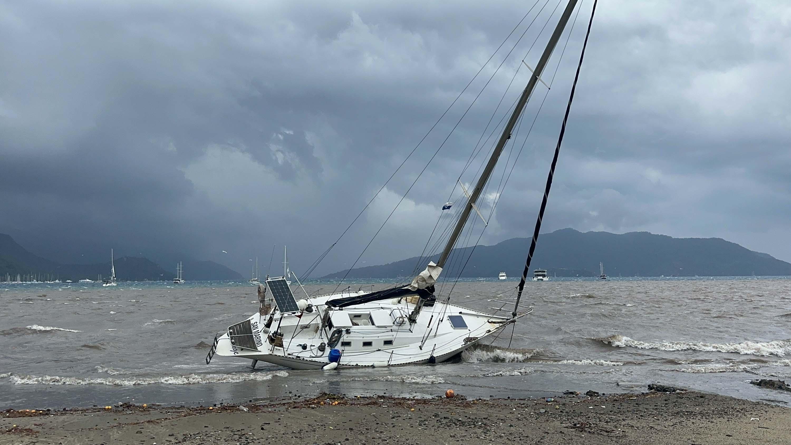 Marmaris'te sağanak ve kuvvetli rüzgar; yelkenli tekneler karaya vurdu