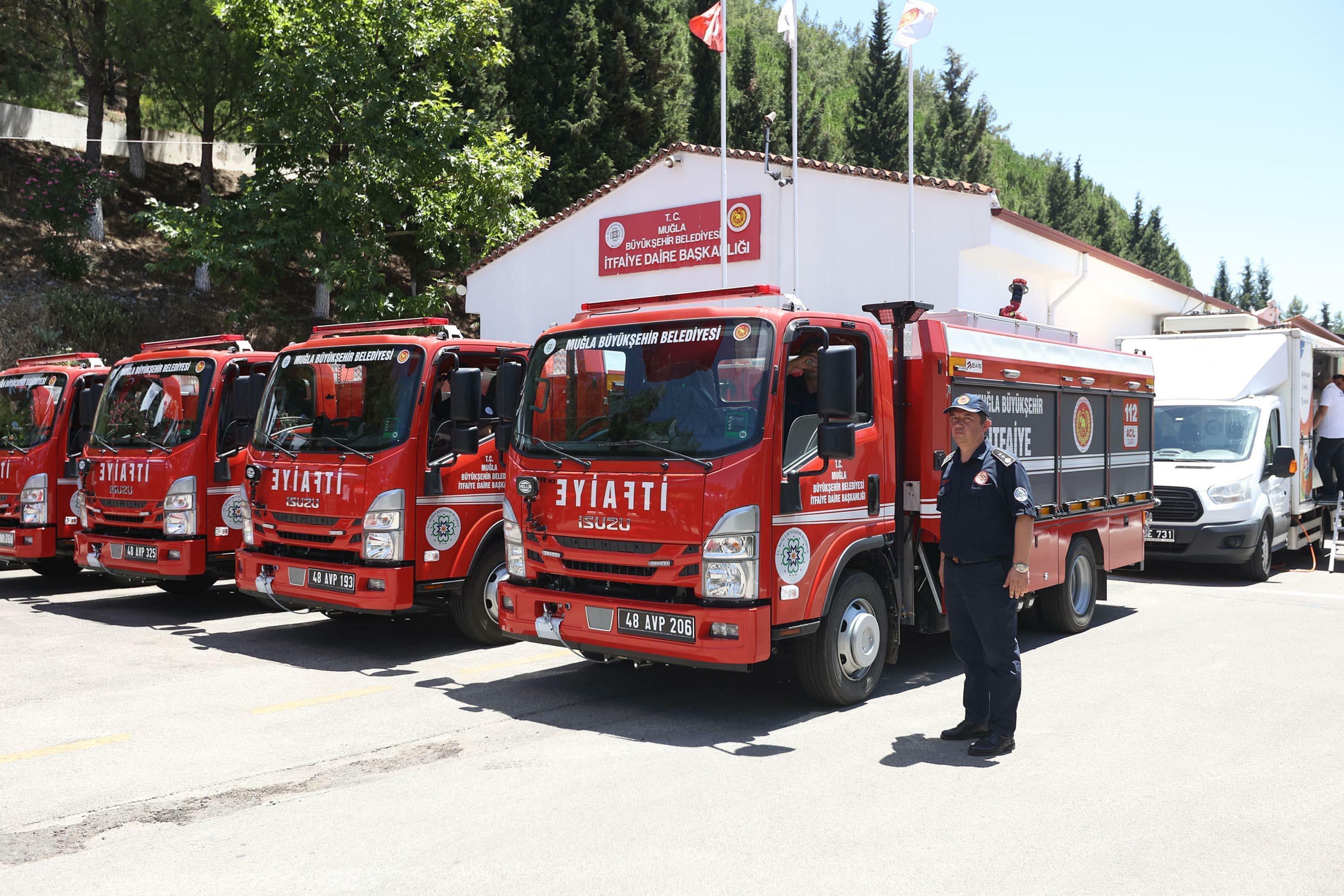 MUĞLA, (DHA)-MUĞLA Büyükşehir Belediyesi, yangınlara karşı mücadelede kullanılmak üzere 6 adet dar alan itfaiye aracını ilçe grup amirliklerine ve 25 adet yangına ilk müdahale tankerini 8 ilçeye düzenlenen törenle teslim etti.