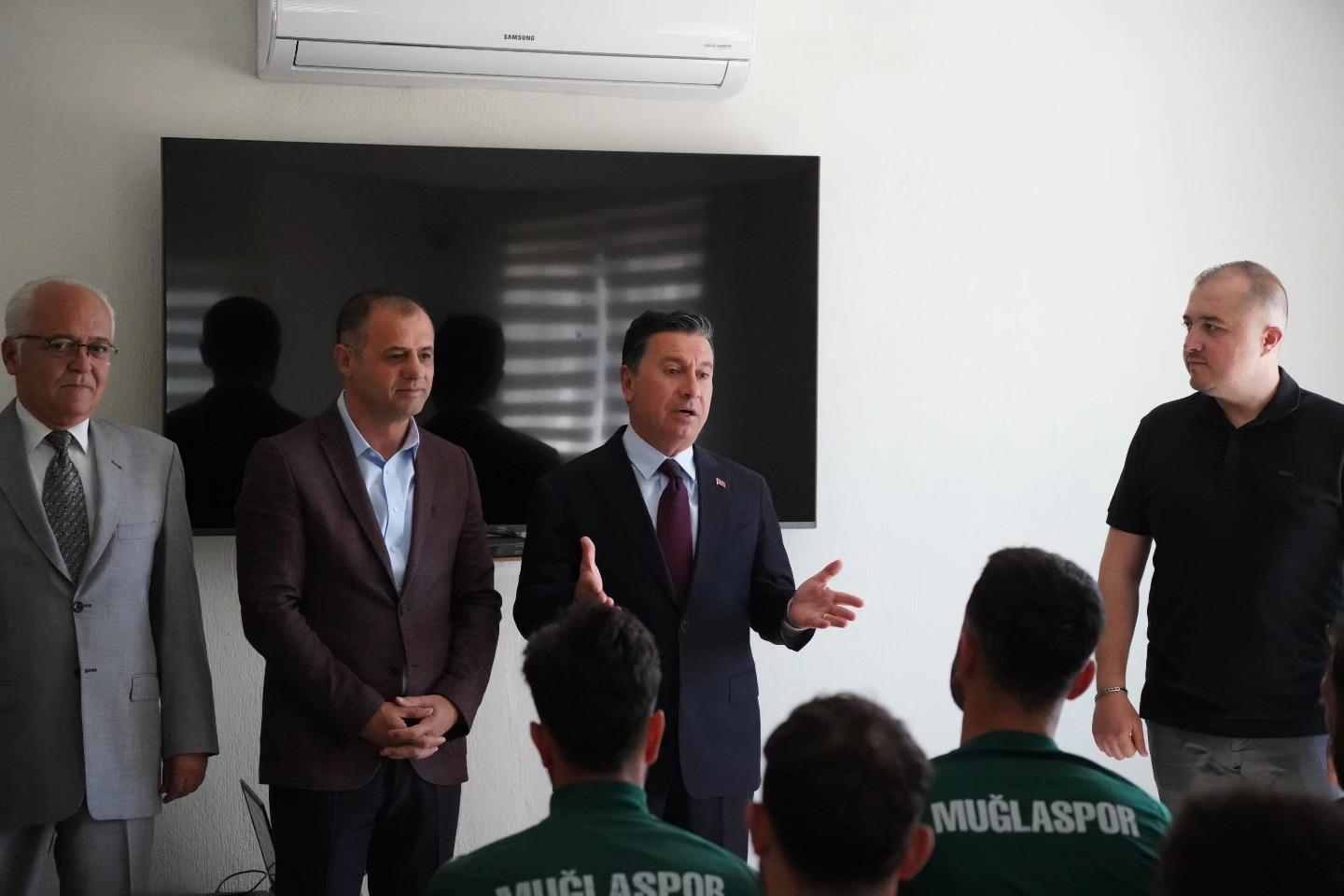 MUĞLA, (DHA)- MUĞLA Büyükşehir Belediye Başkanı Ahmet Aras, 2'nci Lig Beyaz Grup'ta play-off ilk maçında deplasmanda Şanlıurfaspor ile karşılaşacak olan Muğlaspor'u kulüp tesislerinde ziyaret ederek teknik heyet ve futbolcularla bir araya geldi. Ziyarette Başkan Aras, sezon boyunca ortaya konulan mücadele, birlik ve inançtan dolayı tüm takımı tebrik etti. Muğlaspor’un bu sezon sahaya yansıttığı karakterin ve istikrarın takdire şayan olduğunu vurgulayan Aras, "Şehrimizi en iyi şekilde temsil eden takımımızla gurur duyuyoruz. Bu başarıda emeği geçen teknik heyetimizi ve futbolcularımızı kutluyor, play-off sürecinde de aynı azim ve kararlılıkla yolunuza devam edeceğinize inanıyorum" ifadelerini kullandı. Ziyaret kapsamında futbolcularla sohbet eden ve başarı dileklerini ileten Ahmet Aras, Muğla’nın tüm dinamikleriyle Muğlaspor’un yanında olduğunu bir kez daha yineledi. Play-off sürecinde şehrin kenetlenmesinin önemine dikkat çeken Aras, Muğlaspor’un hedeflerine ulaşacağına olan inancını dile getirdi.