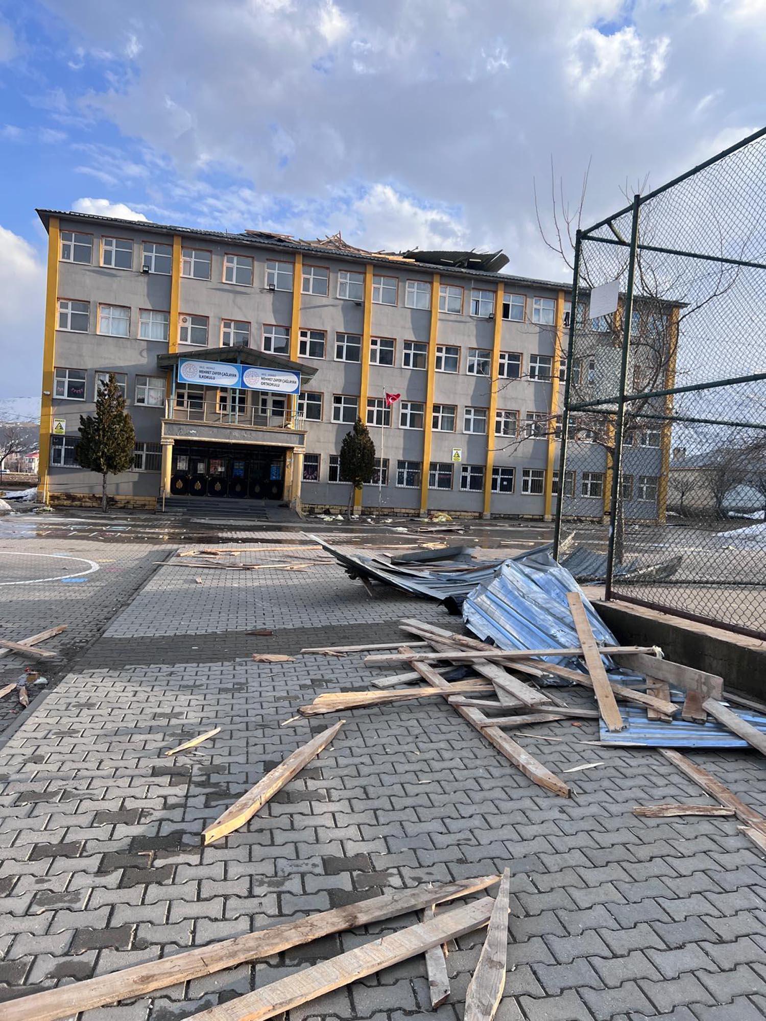 Çatısı uçan Mehmet Zafer Çağlayan İlk ve Ortaokulu'na ekipler sevk edildi. Hasar tespit çalışmalarının ardından İl Milli Eğitim Müdürlüğü'nce okulda eğitime 2 gün ara verildi. Çatının onarımı için çalışmaların başlatıldığı ve en kısa sürede tamamlanmasının hedeflendiği bildirildi. (DHA)