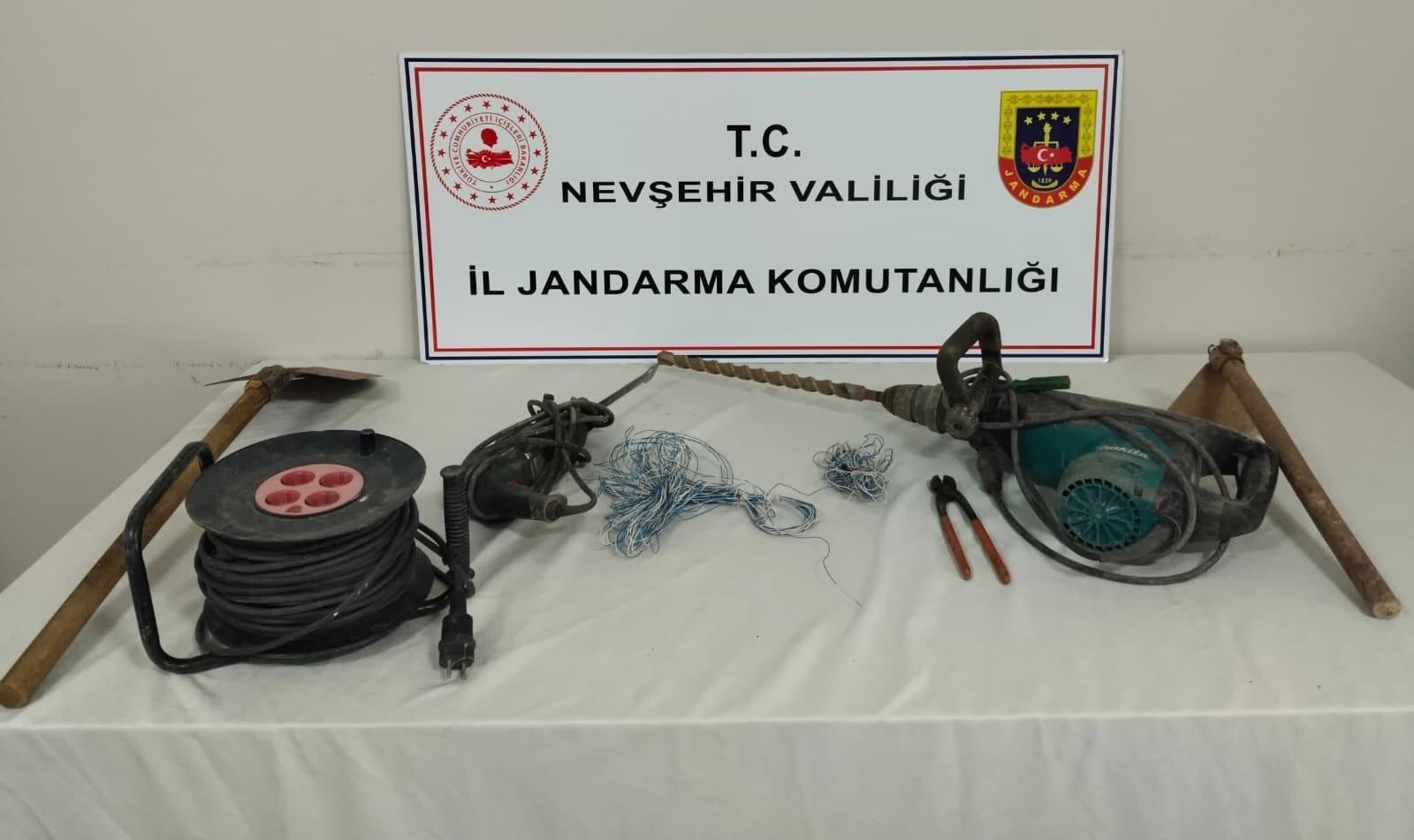 İlçe Jandarma Komutanlığı ekipleri, Derinkuyu ilçesi Özlüce köyünde arazide dron ile kontrol yaptı. Yapılan inceleme N.E., D.E, F.T., Y.K. ve Ç.Ç.’nin el yapımı paylayıcıyla izinsiz kazı yaptıkları tespit edildi. Düzenlenen operasyonda 5 şüpheli yakalanırken, hilti, kürek, 20 metre elektrik kablosu ve EYP düzeneği ele geçirdi. Gözaltına alınan 5 kişi, İlçe Jandarma Komutanlığı’na götürüldü. (DHA)