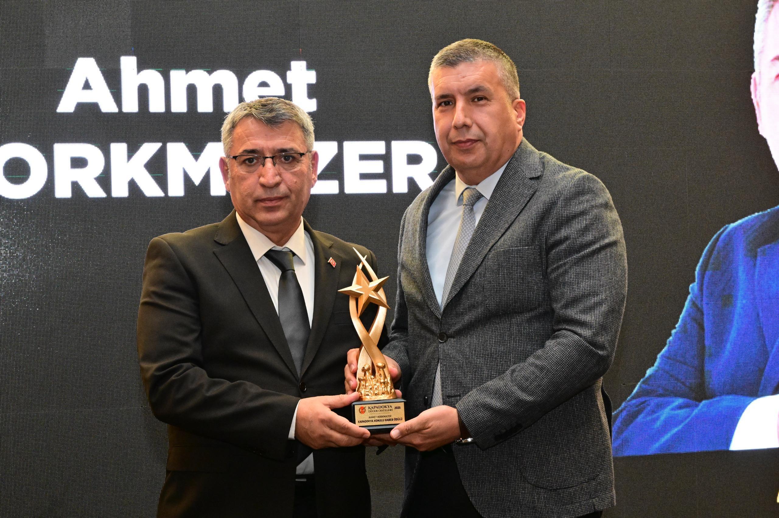 NEVŞEHİR, (DHA)- TÜRKİYE Gazeteciler Federasyonu ile Nevşehir Gazeteciler Cemiyeti işbirliğinde bu ilki düzenlenen ‘Kapadokya Değer Ödülleri’nde DHA muhabiri Ahmet Korkmazer, ödüle layık görüldü.