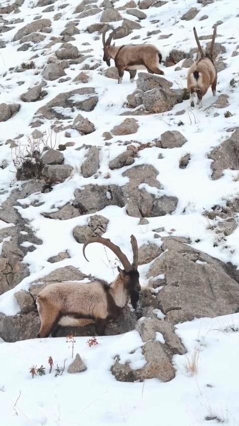 Karlı Aladağlar'da gezen dağ keçileri dron kamerasında