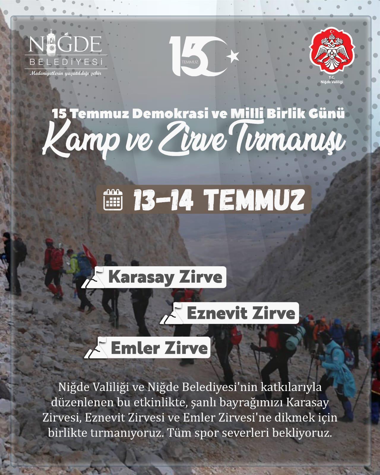Demokrasi ve Milli Birlik Günü etkinlikleri 13 Temmuz’da 'Milli Birlik Günü Kamp ve Zirve Tırmanışı' programı ile başlayacak. 15 Temmuz Destanı Demokrasi Ve Milli Birlik Günü Kamp ve Zirve Tırmanışı için 13 Temmuz’da Niğde Valiliği önümde toplanılacak. Tırmanışa katılacak olan sporcu ve teknik heyet 13 Temmuz’da 09.30’da Şehit Ömer Halisdemir Meydanı’nda yapılacak törene ve Niğde Şehitliğine yürüyüş programına katıldıktan sonra kamp alanına hareket edecek. Aynı gün Çamardı ilçesine bağlı Demirkazık köyünde fidan dikim etkinliği gerçekleştirilecek ve buradan Sokullu Pınarı Kamp Alanı'na geçilecek ve 15 Temmuz yoklaması yapılacak. 14 Temmuz Pazar günü sabah 04.00’dezirve tırmanışının startı verilecek. Sırasıyla 3562 rakımlı Karasay Zirvesi, 3551 rakımlı Eznevit Zirvesi ve 3723 rakımlı Emler Zirvesine tırmanış gerçekleştirilecek. Her üç zirveye de şehitlerin anısına bayraklar dikilecek.
