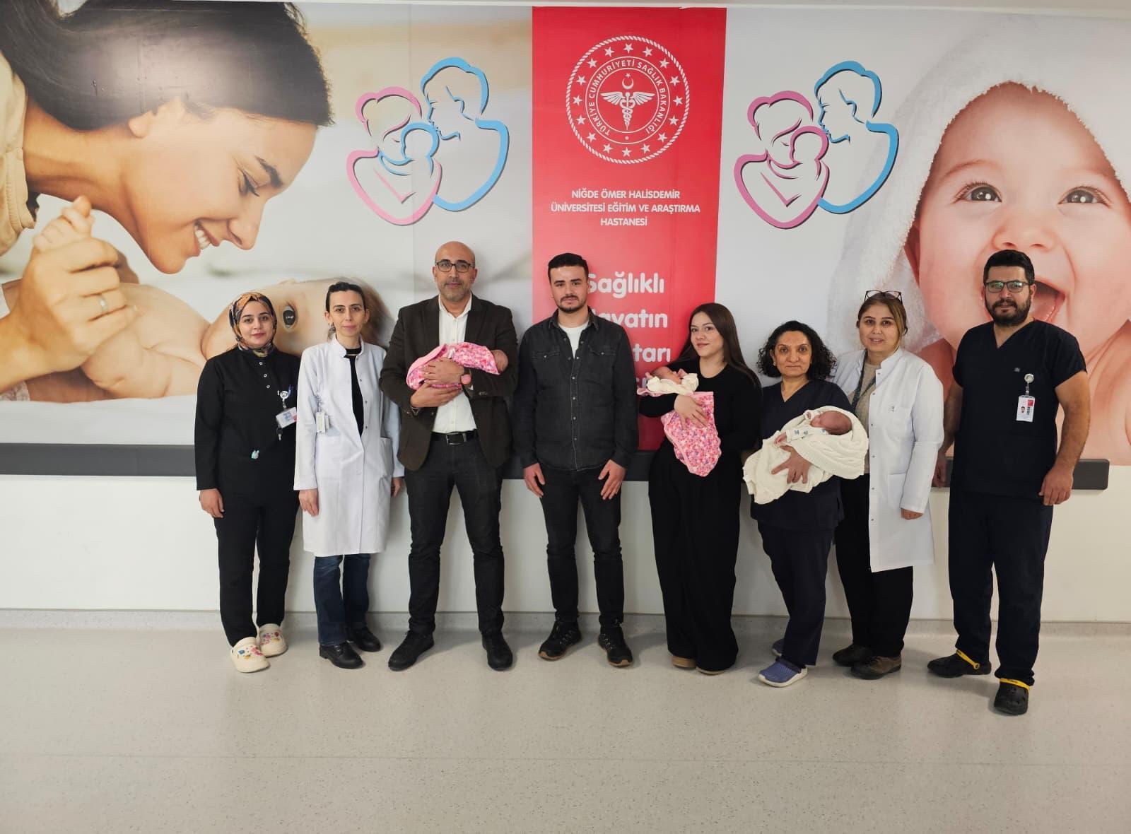 Niğde Ömer Halisdemir Eğitim ve Araştırma Hastanesinde Yasin–Esra Yurer çiftinin 31'inci gebelik haftasında 1350 gram, 1510 gram ve 1920 gram ağırlığında doğan Alpay, Gülnaz ve Mihra isimli bebekleri, prematüre doğuma bağlı gelişen solunum sıkıntısı nedeniyle uzman hekimler ve sağlık personelinin gözetiminde tedavi altına alındı. Yoğun bakım ünitesinde titizlikle yürütülen takip ve tedavi sürecinin ardından bebeklerin genel sağlık durumlarının stabil hale geldiği ve taburculuk için uygun görüldüğü bildirildi.
