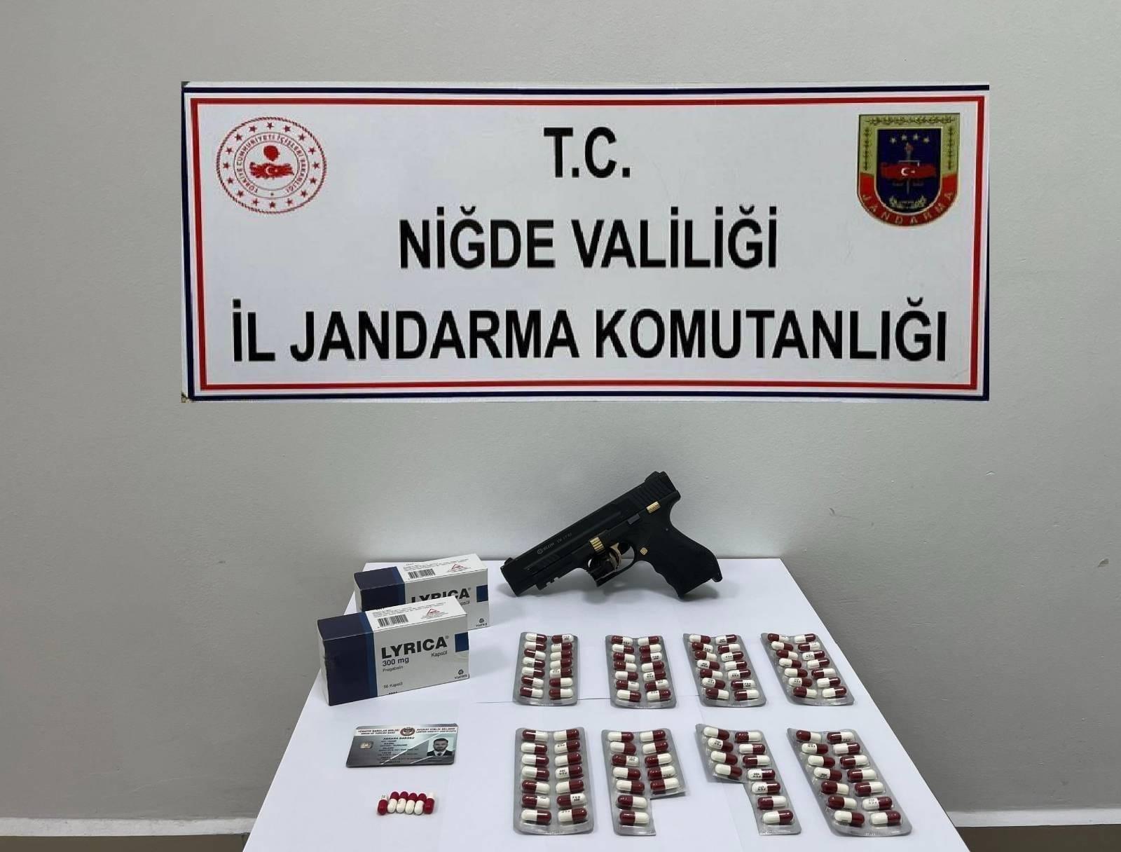 İl Jandarma Komutanlığı ekiplerince Ulukışla ilçesi Çifteköy Köyü mevkiindeki dinlenme tesisinde şüpheli bir kişinin aracında arama yapıldı. 1 ruhsatsız tabanca, 1 tabanca şarjörü, 113 adet uyuşturucu hap ve 1 sahte avukat kimliği bulunan aracın sürücünü gözaltına alındı. Olayla ilgili soruşturma başlatıldı. DHA)