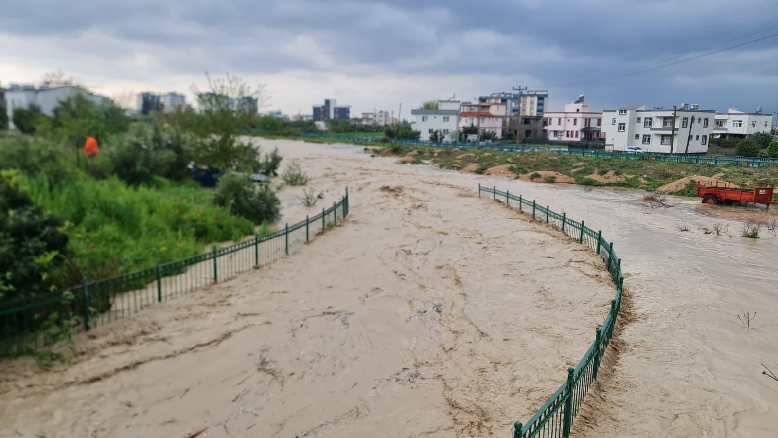 Gece taşan Bülbül Deresi'nin de döküldüğü Savrun Çayı'nda da su seviyesi, tehlikeli boyuta ulaştı. Kadirli Belediyesi ve AFAD ekipleri, su basan bölgelerde önlemler alırken; Savrun Çayı çevresinde taşkın riskine karşı önlemler artırıldı. (DHA)