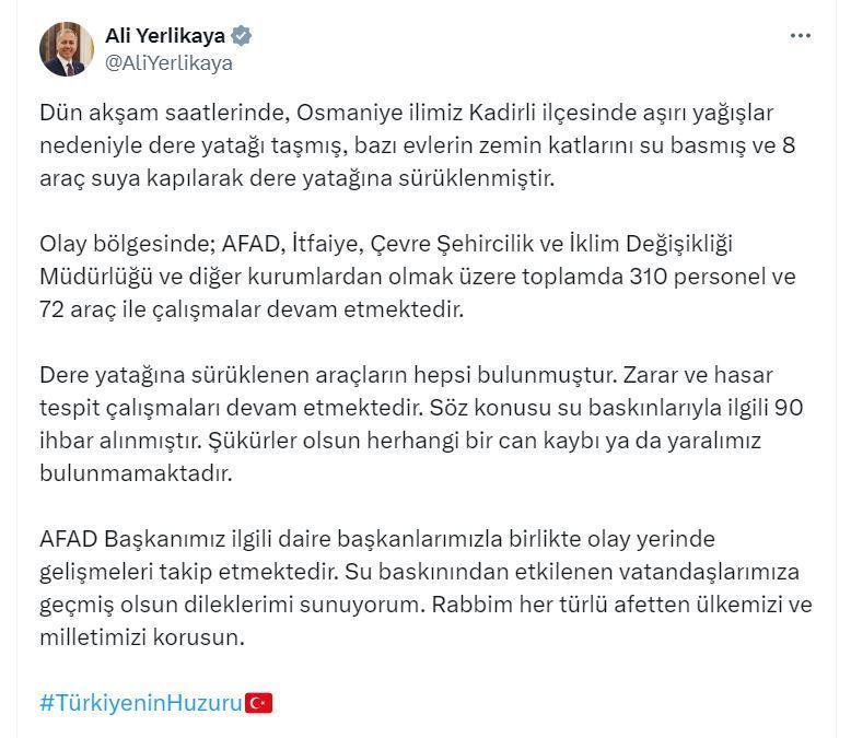 İçişleri Bakanı Ali Yerlikaya, olayla ilgili sosyal medya hesabından açıklama yaparak, "Dün akşam saatlerinde, Osmaniye ilimiz Kadirli ilçesinde aşırı yağışlar nedeniyle dere yatağı taşmış, bazı evlerin zemin katlarını su basmış ve 8 araç suya kapılarak dere yatağına sürüklenmiştir. Olay bölgesinde; AFAD, itfaiye, Çevre, Şehircilik ve İklim Değişikliği Müdürlüğü ve diğer kurumlardan olmak üzere toplamda 310 personel ve 72 araç ile çalışmalar devam etmektedir" dedi.