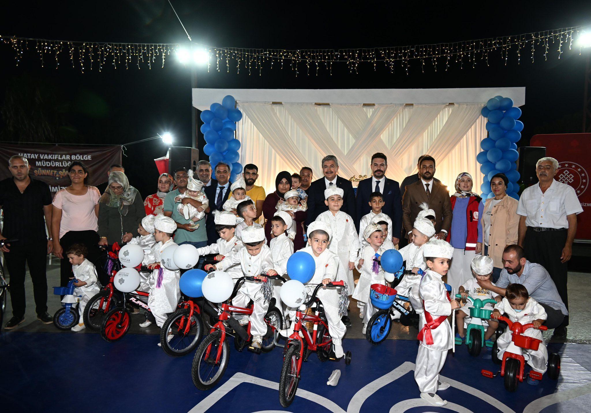 Kültür ve Turizm Bakanlığı Vakıflar Genel Müdürlüğü, Osmanlı döneminde kurulan vakıfların senetlerinde yer alan hayır şartlarını yerine getirmeye devam ediyor. Bu kapsamda Hatay Vakıflar Bölge Müdürlüğü tarafından, deprem bölgesi Osmaniye’de 28 çocuk için toplu sünnet şöleni düzenlendi. Polisevi’nde ki program açılış konuşmaları ile başladı, ardından Osmaniye İl Müftü Vekili Ahmet Sevinç tarafından Kur’an-ı Kerim okunarak dua edildi. Ardından Vali Erdinç Yılmaz, Hatay Vakıflar Bölge Müdürü Adem Bozkurt ve protokol üyeleri sünnet olan çocuklara altın ve bisiklet hediye etti. Program, toplu hatıra fotoğrafı çekimi, pasta kesimi ve balonların gökyüzüne bırakılmasıyla devam etti. Çocuklar, şişme oyun alanlarında ve maskotlarla doyasıya eğlenirken, aileler de müzik eşliğinde unutulmaz bir gün yaşadı.