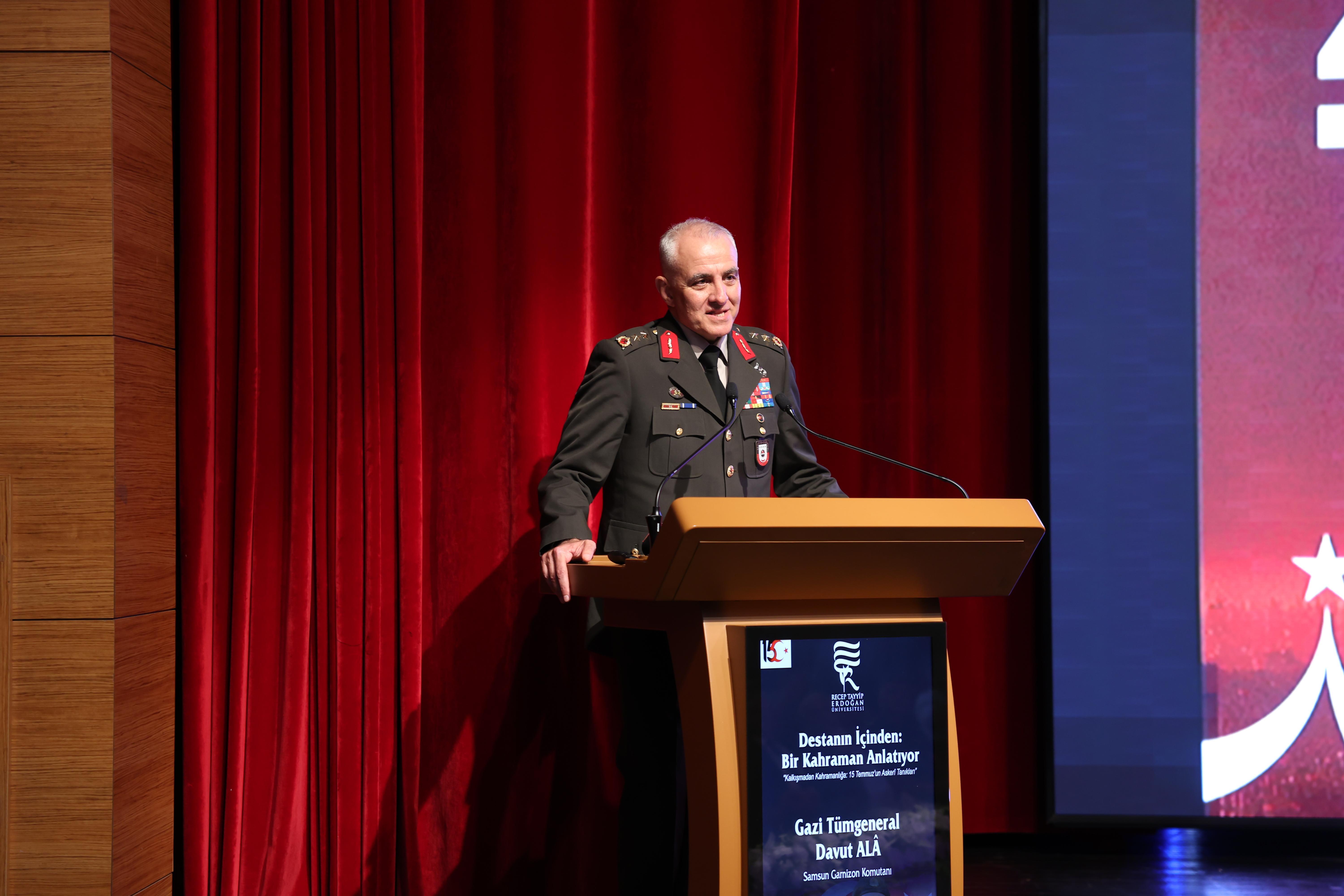 Mehmet Can PEÇE/ RİZE, (DHA)- RİZE’de, Samsun Garnizon Komutanı ve 15 Temmuz Gazisi Tümgeneral Davut Ala, Recep Tayyip Erdoğan Üniversitesi’nde düzenlenen ‘Destanın İçerisinden Bir Kahraman Anlatıyor’ konferansında 15 Temmuz gecesi ve sonrasında yaşadıklarını anlattı.