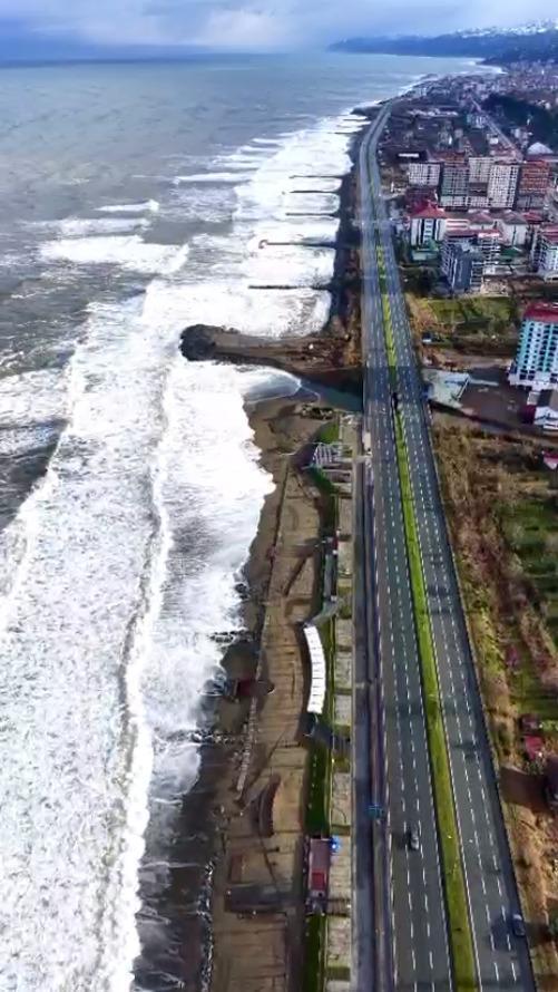Rize'nin Pazar ve Ardeşen ilçelerinde Karadeniz Sahil Yolu'na vuran dev dalgalar, dron ile görüntülendi. Görüntülerde; sahilde dalgaların boyunun zaman zaman metrelerce yukarı çıktığı ve denizin yükseldiği görüldü. (DHA)