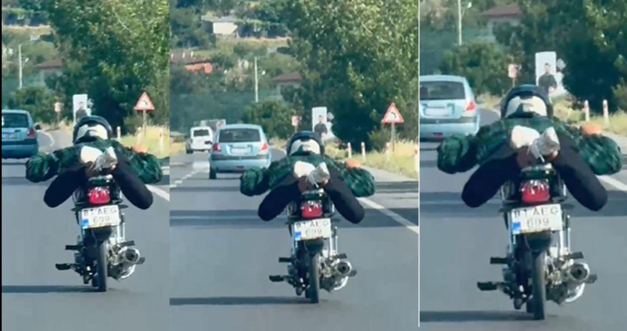 D-650 Karayolu’nun Adapazarı-Karasu istikametinde seyir halinde olan 81 AEG 699 plakalı motosikletin sürücüsü, akrobatik hareketler yaparak hem kendi hem de trafikteki diğer vatandaşların hayatını tehlikeye attı. Bir vatandaş tarafından cep telefonu kamerasıyla kaydedilen görüntülerde, motosiklet sürücüsü aracın üzerinde yatar pozisyonda kilometrelerce seyahat etti. Sürücünün bu tehlikeli hareketi yoğun trafikte uzun süre devam etti. Görüntülerde sürücünün sadece dengesini değil, çevresindeki araçları da hiçe sayarak riskli şekilde ilerlediği görüldü. (DHA)