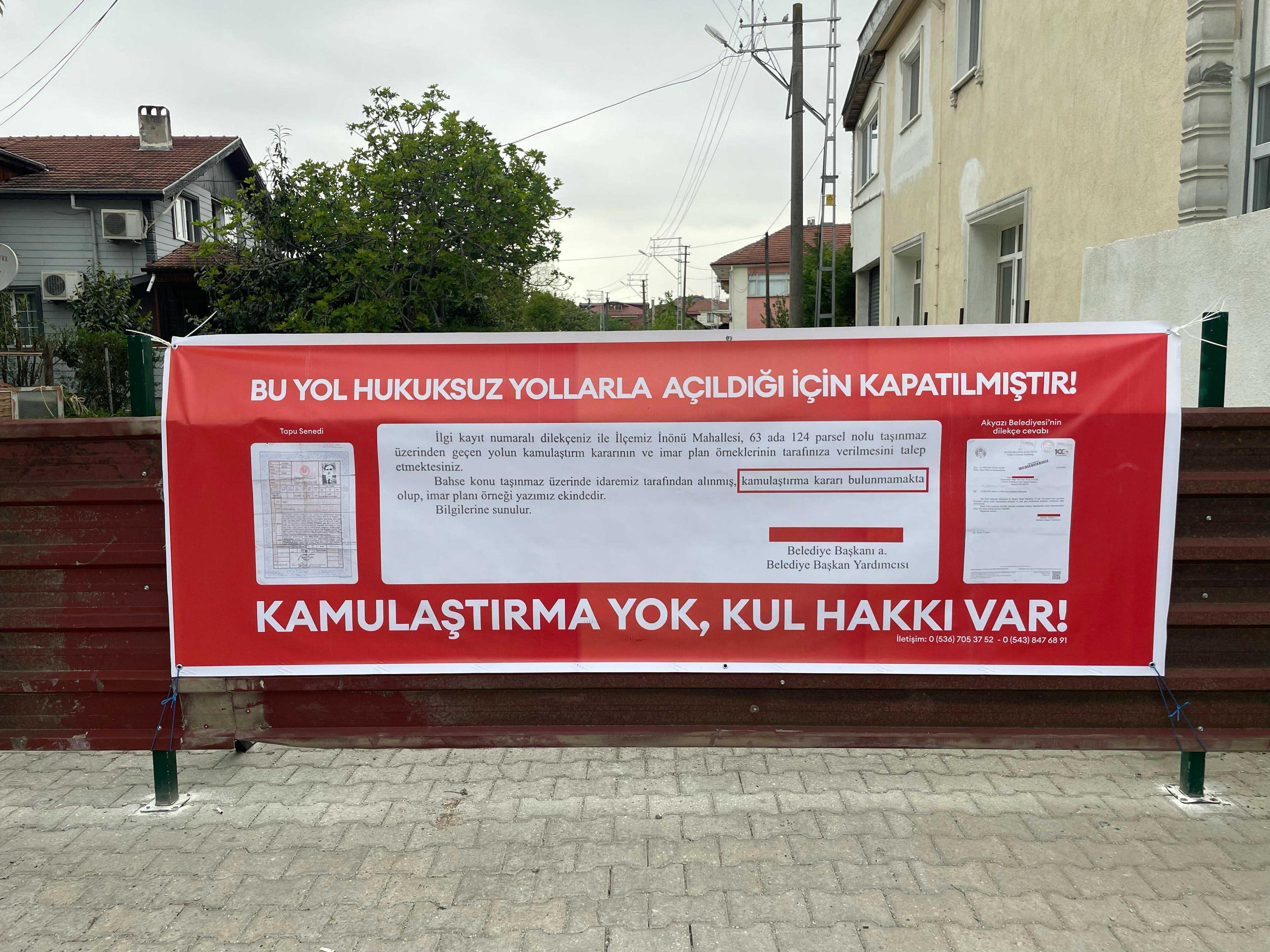 Akyazı ilçesi İnönü Mahallesi 7024 No’lu Sokak’taki 63 ada 124 parselin içinden geçen yol, 25 yıl önce belediye tarafından kamulaştırma yapılmadan açıldığı iddiasıyla arsa sahipleri tarafından kapatıldı. Arsa sahibi Asım Erol'un torunu Recep Erol, yıllardır süren bu mağduriyetin çözülmesi için Akyazı Belediyesi ile iletişime geçtiklerini ancak olumlu bir yanıt alamadıklarını ifade etti. Belediye Başkanı Bilal Soykan ile görüştüklerini belirten Erol, Başkan Soykan’ın konunun hukuki yollarla çözülmesini tavsiye ettiğini söyledi.
