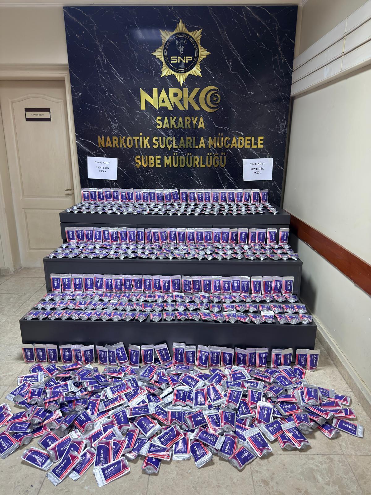 Sakarya Cumhuriyet Başsavcılığı koordinesinde, İl Emniyet Müdürlüğü Narkotik Suçlarla Mücadele Şube Müdürlüğü ekipleri tarafından yürütülen çalışmalarda İstanbul’dan Akyazı ilçesine uyuşturucu madde getirileceği bilgisine ulaşıldı. Ekipler, şüpheli S.K. (31) yönetimindeki cipi Anadolu Otoyolu'nda durdurmak istedi. 'Dur' ihtarına uymayan sürücü, kaçtı. Araç, polisin takibi sonucu Akyazı ilçesinde yakalandı. Araçta yapılan aramada 33 bin 400 adet sentetik ecza ele geçirildi. Gözaltına alınan ve emniyetteki işlemlerinin ardından adliyeye sevk edilen S.K., tutuklandı.