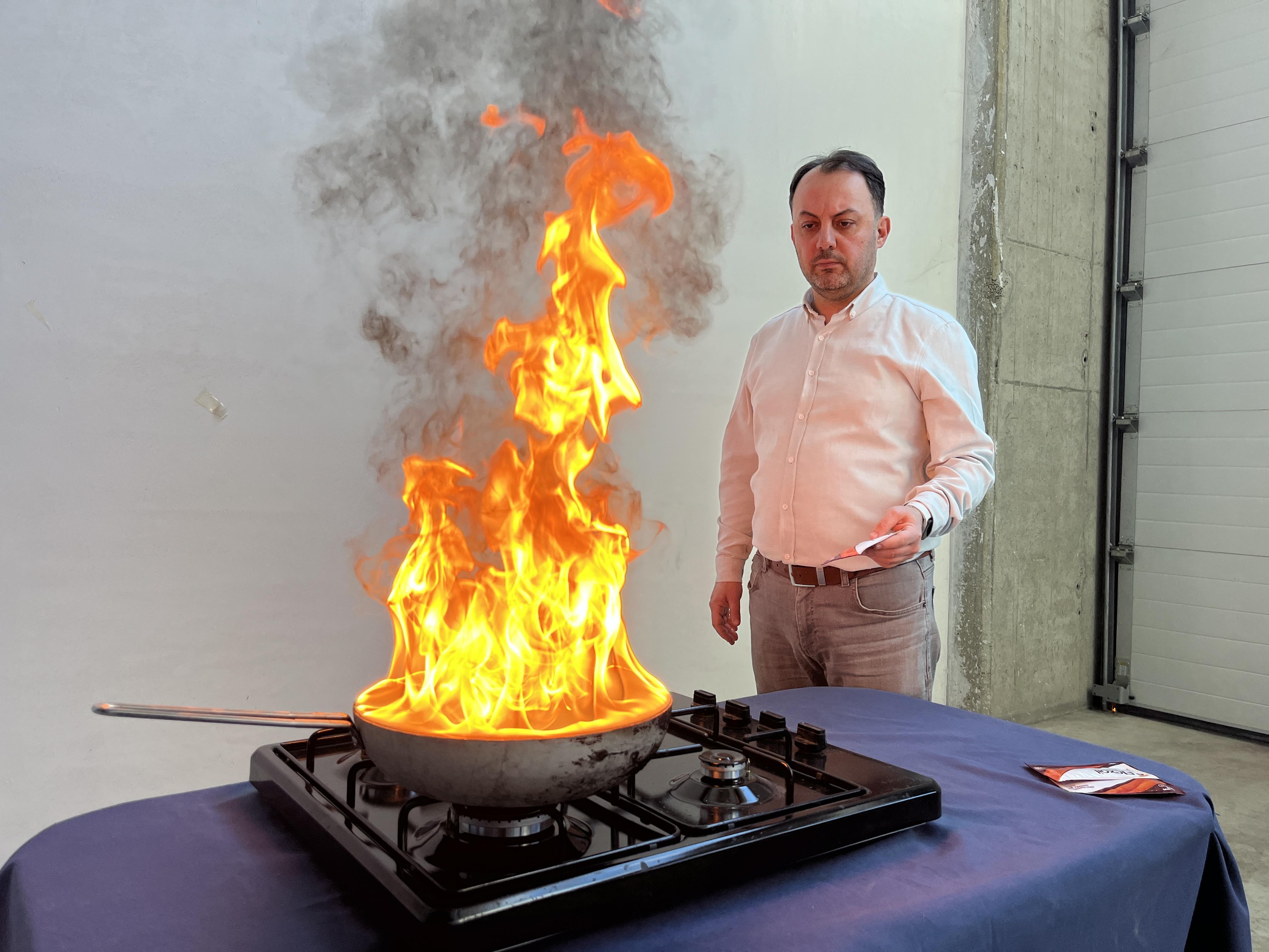 Yağ yangınlarının söndürülmesi en zor yangın türü olduğunu belirten firmanın Yönetim Kurulu Başkan Vekilli Haktan Adıgüzel, "Bunu çok hızlı ve pratik şekilde söndürmek amacıyla bir ürün geliştirdik. Bu ürünün amacı, yangına çok hızlı müdahale edilmesi. Yangında saniyeler çok önemlidir. Bu sebeple hızlı ve ekonomik şekilde müdahale edebileceğimiz bir ürün ortaya çıkardık. Ürünün amacı da yangını güvenli bir şekilde söndürmek. Kullanımı çok basit; ilk önce ocağın altını kapatmanız gerekiyor. Daha sonra ürünü tavanın veya fritözün kenarından bıraktığınız zaman yeterlidir. Yaklaşık 10-15 saniye içerisinde yangını hızlı bir şekilde söndürür" dedi.