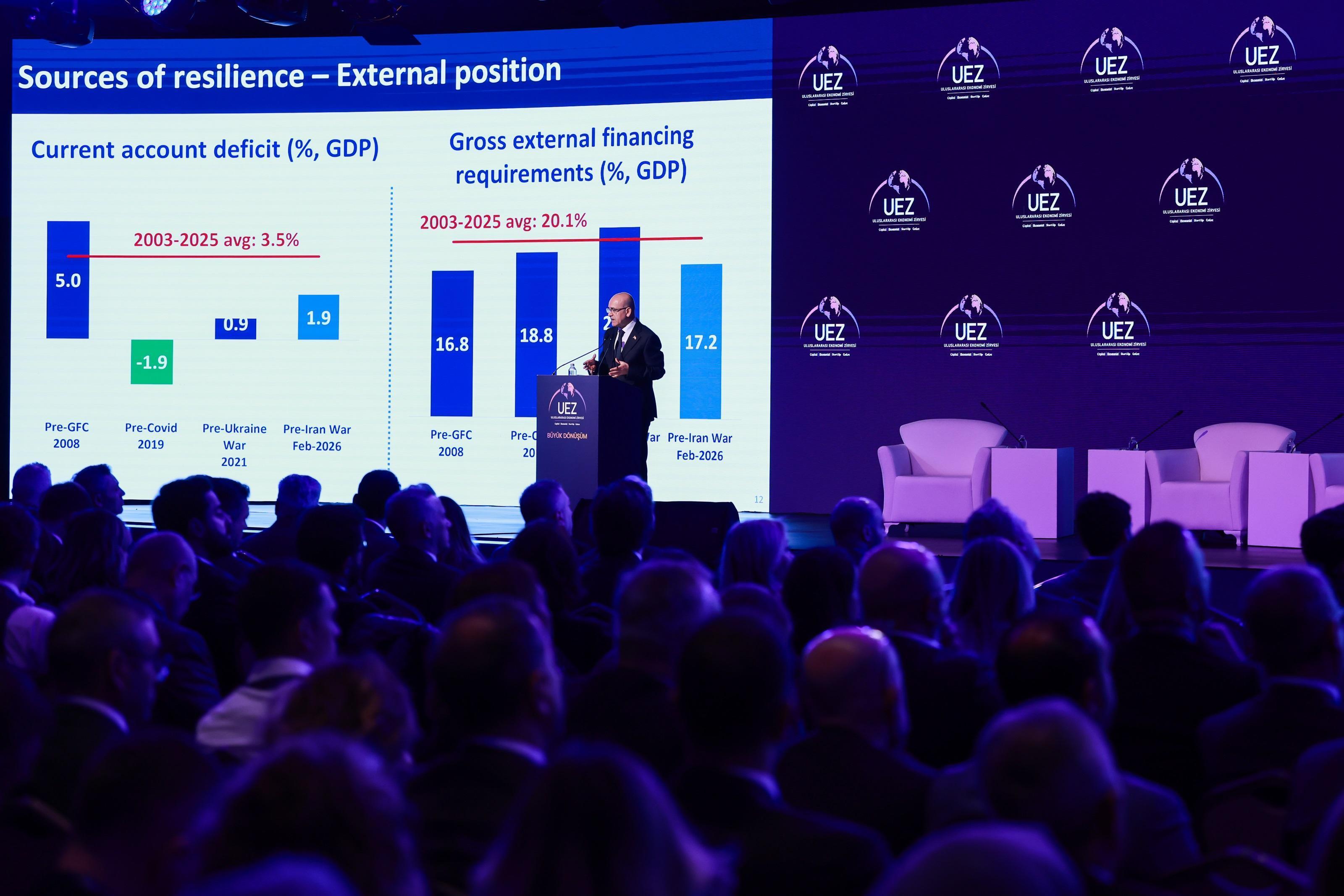 İrem Çağla ZİNCİRLİ-Emir Efe BENLİOĞLU/SAKARYA,(DHA)- ULUSLARARASI Ekonomi Zirvesi‘nde (UEZ) konuşan Hazine ve Maliye Bakanı Mehmet Şimşek, “Savaşın getirdiği yıkım ve bunun rehabilitasyonu biraz zaman alacak. Bugün ateşkes devam etse dahi etkileri hissedilecek. Jeopolitik olarak da ne bölge ne dünya eskisine dönmeyecek. Büyük kırılmaların olduğu bir dönemdeyiz. Sadece ticaret savaşları değil, sadece demografik yapıdaki bozukluklar ve bunu getirdiği riskler değil, sadece iklim krizi değil, aslında birçok boyutuyla zorlu bir dönem yaşadığımız için dünyada büyük kırılmalar yaşanıyor. Savaşlar aslında canavarlar dönemini yansıtıyor. Yeni bir dünya düzeni kurulanana kadar umarım ABD ve Çin bir uzlaşmaya varır. Savaşların diğer şoklara oranla çok daha kalıcı, çok daha büyük sonuçlar doğurduğunu gösteriyor. Türkiye’nin dayanıklı olduğuna inanıyoruz. Bunu da geçen sene ispatladık. Bu sene de ispatlayacağız" dedi.
