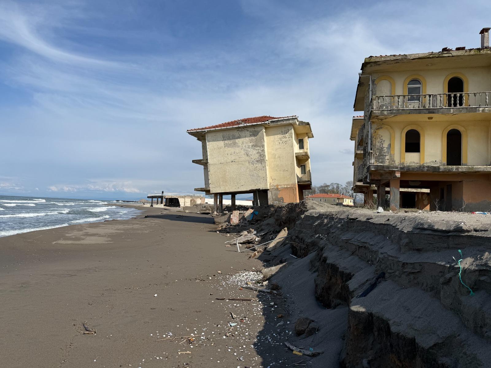 Levent KIZILASLAN/ KARASU(Sakarya), (DHA)- SAKARYA’nın Karasu ilçesi sahilinde kıyı erozyonu nedeniyle 2020 yılında tahliye edilen 9 villadan biri yan yattı.
