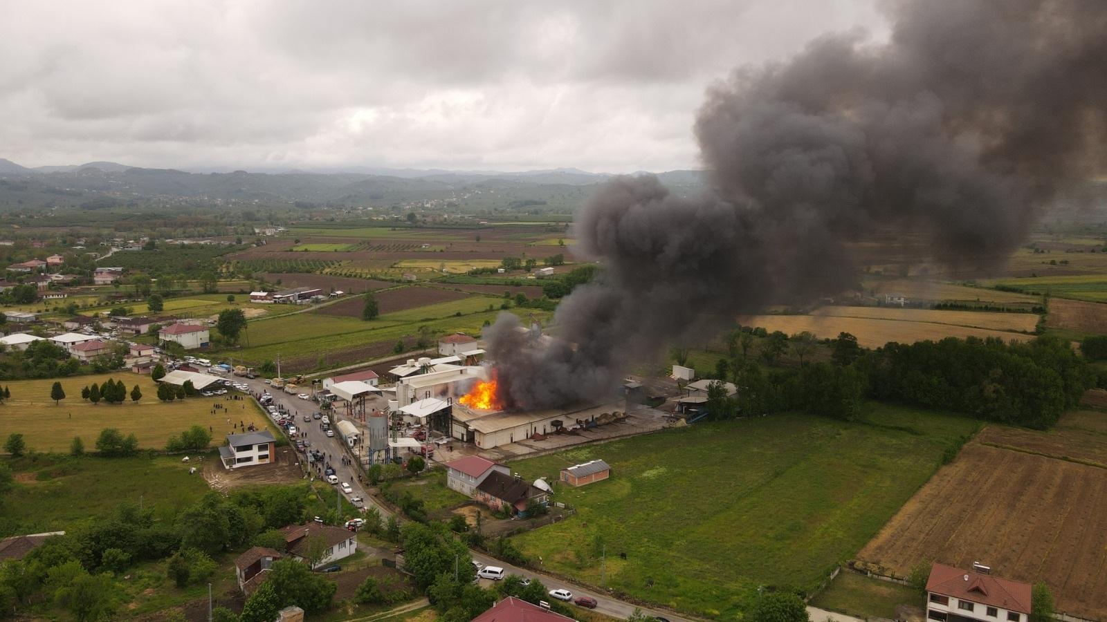 Sakarya’nın Karasu ilçesi Adatepe Mahallesi'nde fındık kırım fabrikasında çıkan, itfaiye ekiplerinin müdahalesiyle 2,5 saatte kontrol altına yangın, havadan görüntülendi. (DHA)
