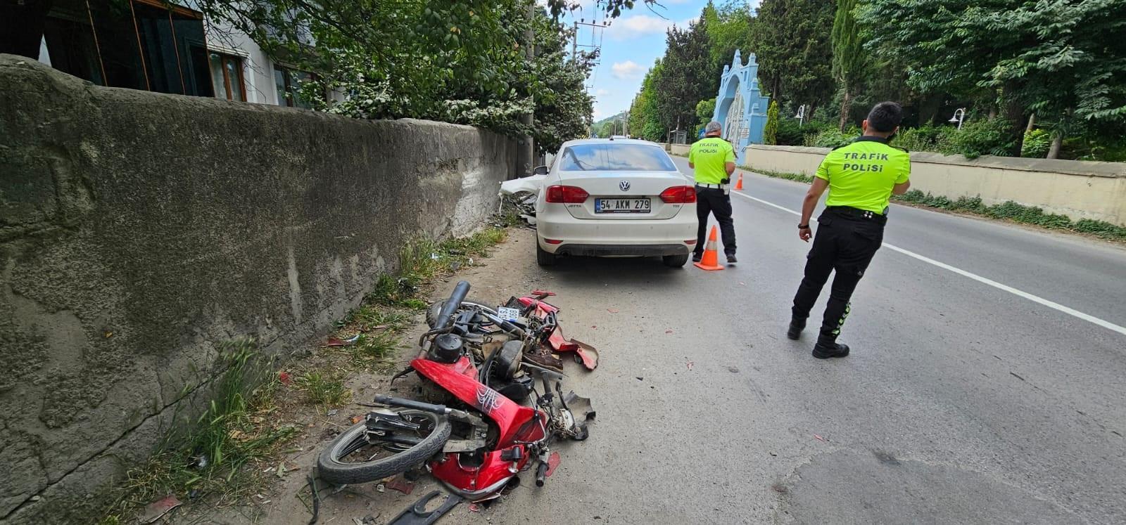 Kaza, akşam saatlerinde Camiced Mahallesi Kemalettin Sami Paşa Caddesi üzerinde meydana geldi. Mehmet Emin Yıldız (57) idaresindeki 54 SJ 068 plakalı motosiklet karşı yönden gelen A.İ. yönetimindeki AKM 279 plakalı otomobille çarpıştı. Çarpışmanın etkisiyle metrelerce savrulan motosiklet sürücüsü bahçe duvarını aşıp evin bahçesine düştü. Çevredekilerin ihbarı üzerine olay yerine sağlık ve polis ekipleri sevk edildi. Yaralı sürücü sağlık ekipleri tarafından Sapanca Devlet Hastanesine kaldırıldı. Burada yapılan ilk müdahalenin ardından Sakarya Eğitim ve Araştırma Hastanesine sevk edildi. Yıldız'ın hayati tehlikesinin bulunduğu öğrenilirken, polis kaza ile ilgili inceleme başlattı. (DHA)