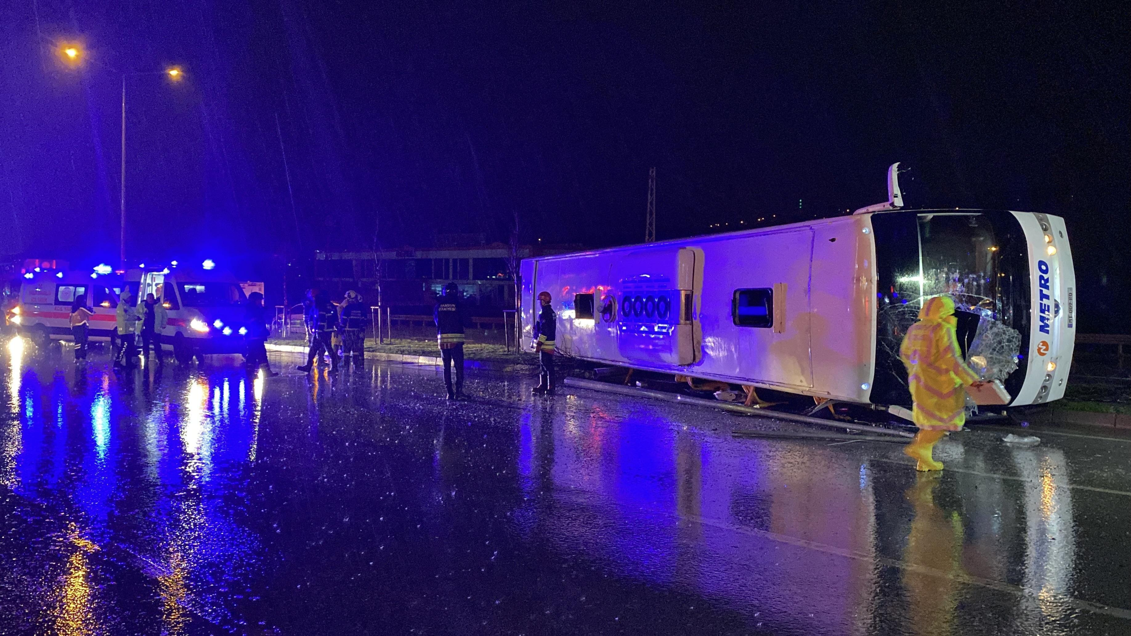 Kaza, saat 23.00 sıralarında İlkadım ilçesi Toybelen mevkisi Samsun-Ankara karayolunda meydana geldi. Ankara’dan Gürcistan’a giden MT-009-RO plakalı yolcu otobüsü, seyir halindeyken sürücüsünün direksiyon hakimiyetini kaybetmesi sonucu orta refüje çıkıp yan yattı. Otobüste bulunan 11 yolcudan 6’sı yaralandı. İhbar üzerine olay yerine polis, itfaiye ve sağlık ekipleri sevk edildi. İtfaiye ekipleri, yan yatan otobüste sıkışan yolcuları bulundukları yerden çıkararak, sağlık ekiplerine teslim etti. Yaralılar, ilk müdahalelerinin ardından çevredeki hastanelere kaldırıldı.