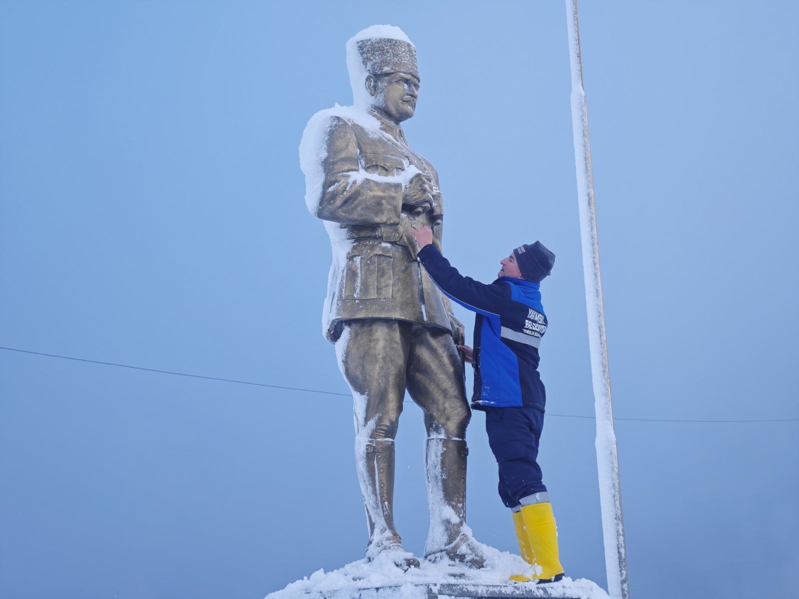 Karlı Atatürk Heykeli’ni eliyle temizledi
