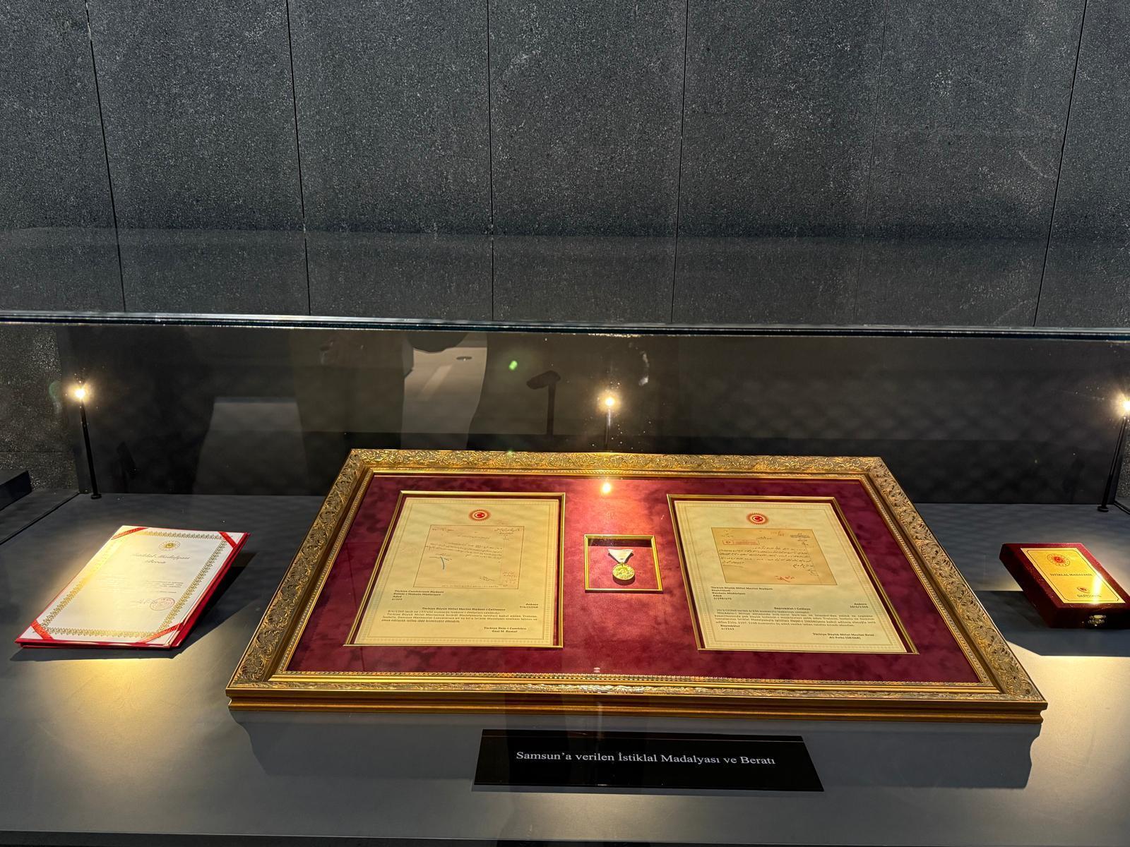 Gökhan İÇKİLLİ/SAMSUN, (DHA)-TÜRKİYE Büyük Millet Meclisi'nde (TBMM) düzenlenen törenle 101 yıl sonra Samsun'a teslim edilen İstiklal Madalyası ve beratı, Samsun Müzesi'nde sergilenmeye başlandı.