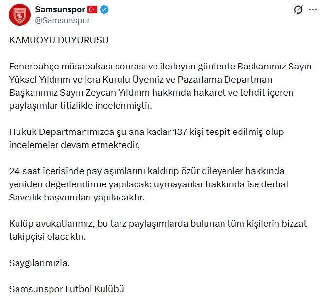 Berkay YILDIZ / SAMSUN, (DHA)- SAMSUNSPOR Kulübü, Fenerbahçe maçı sonrası Başkan Yüksel Yıldırım ve İcra Kurulu Üyesi Zeycan Yıldırım’a yönelik sanal medya üzerinden yapılan hakaret ve tehdit içerikli paylaşımlar hakkında 137 kişinin tespit edildiğini ve 24 saat içinde özür dilenmemesi halinde yasal süreç başlatılacağını duyurdu.