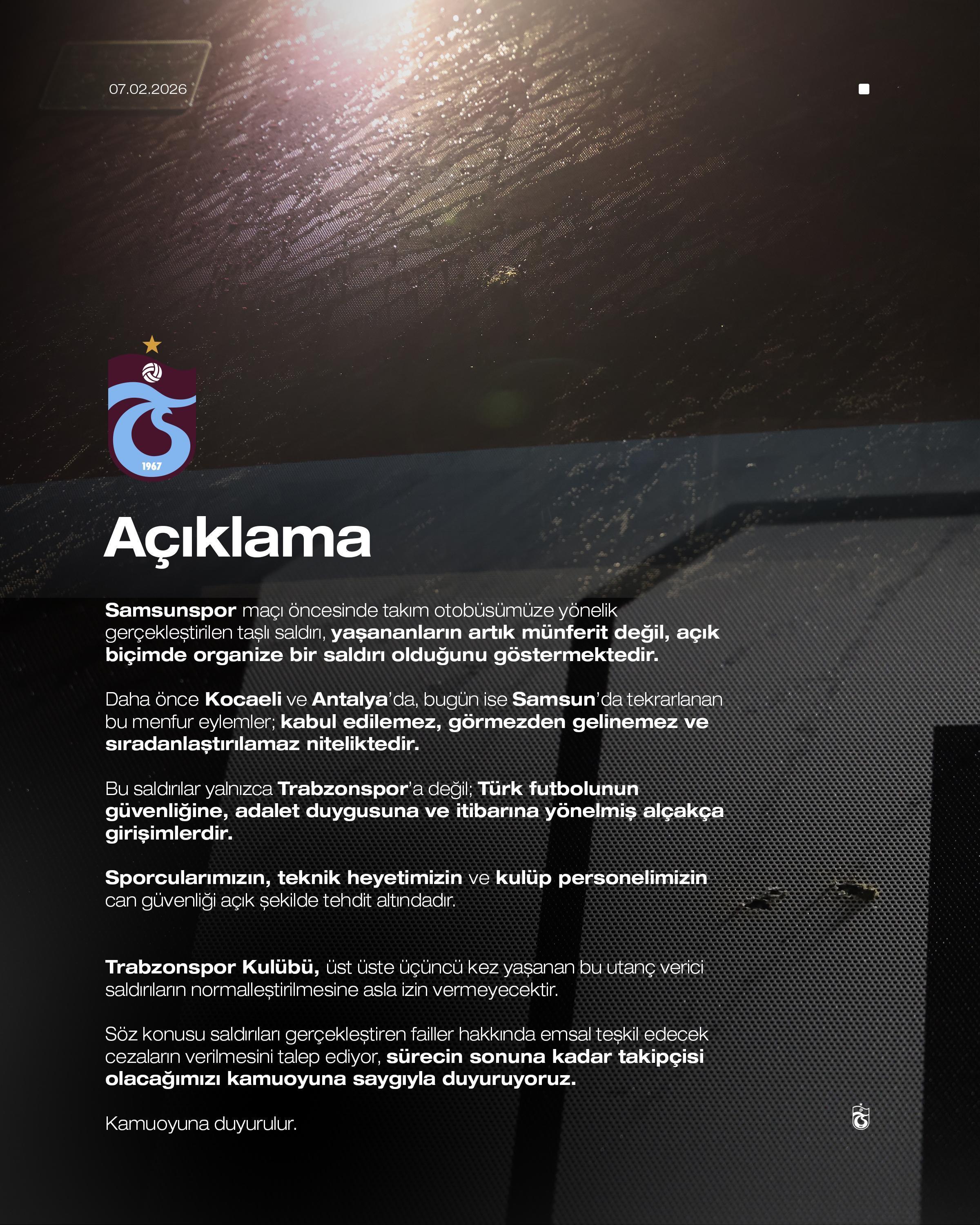Emre ÖNCEL/SAMSUN, (DHA)- TRABZONSPOR, Samsunspor maçı öncesinde takım otobüsüne yapılan taşlı saldırı sonrası sanal medya hesabından açıklama yaptı.