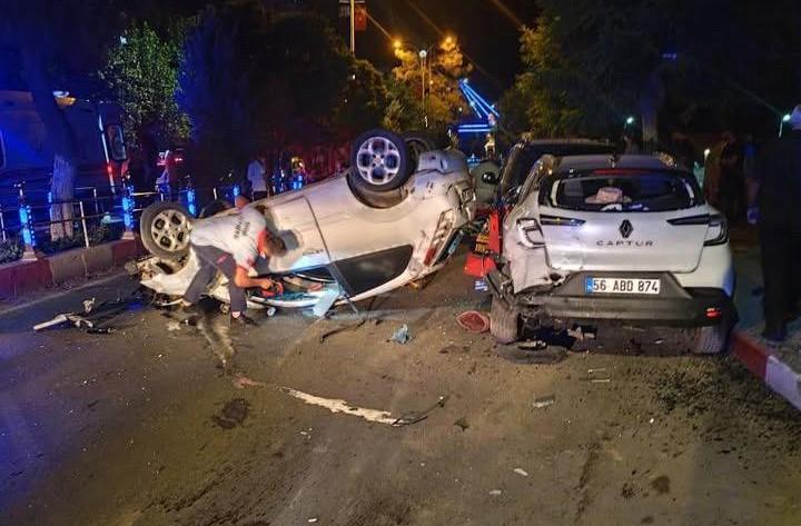 Kaza, dün gece saatlerinde Karayolları Şube Müdürlüğü önünde meydana geldi. M.H.K.'nin (26) direksiyon hakimiyetini kaybettiği 15 AAH 086 plakalı otomobil, refüje çarpıp takla attıktan sonra park halindeki 56 ABD 874 plakalı otomobile çarptı. Kazada, ters dönen otomobilin sürücüsü M.H.K ile yanındaki M.V.S. (20), D.Ç. (21), M.E. (17) ve B.C. (20) yaralandı. İhbarla kaza yerine sağlık, itfaiye ve polis ekipleri sevk edildi. İtfaiye ekipleri tarafından araçtan çıkarılan yaralılar, sağlık ekiplerine teslim edilerek Siirt Eğitim ve Araştırma Hastanesi’ne kaldırıldı. Yaralılardan 2’sinin hayati tehlikesinin olduğu belirtildi.