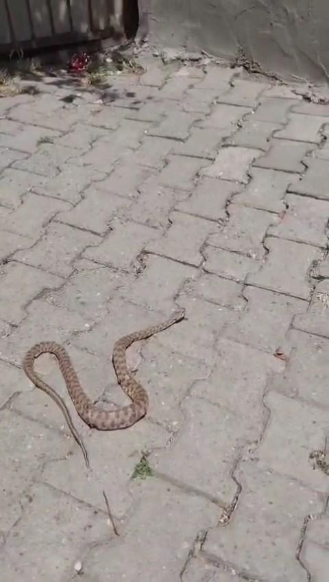 Merkez Yeni Mahalle Cengiz Topel Caddesi 1512’nci Sokakta yaşayan Abdullah Apuhan, evinin önünde yaklaşık 1,5 metre uzunluğundaki yılanı cep telefonu kamerasıyla görüntüledi. Yılan, bir süre caddede dolaştıktan sonra molozların altına girerek gözden kayboldu. (DHA)
