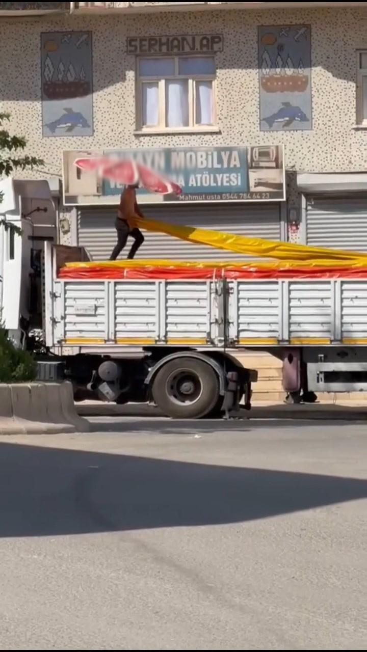 Sekvan KÜDEN/CİZRE(Şırnak), (DHA)-ŞIRNAK'ın Cizre ilçesinde kamyondan yük indiren kişi, beline bağladığı büyük şemsiye ile 47 dereceyi bulan sıcak havadan korunmaya çalıştı. O anlar, kameraya yansıdı.